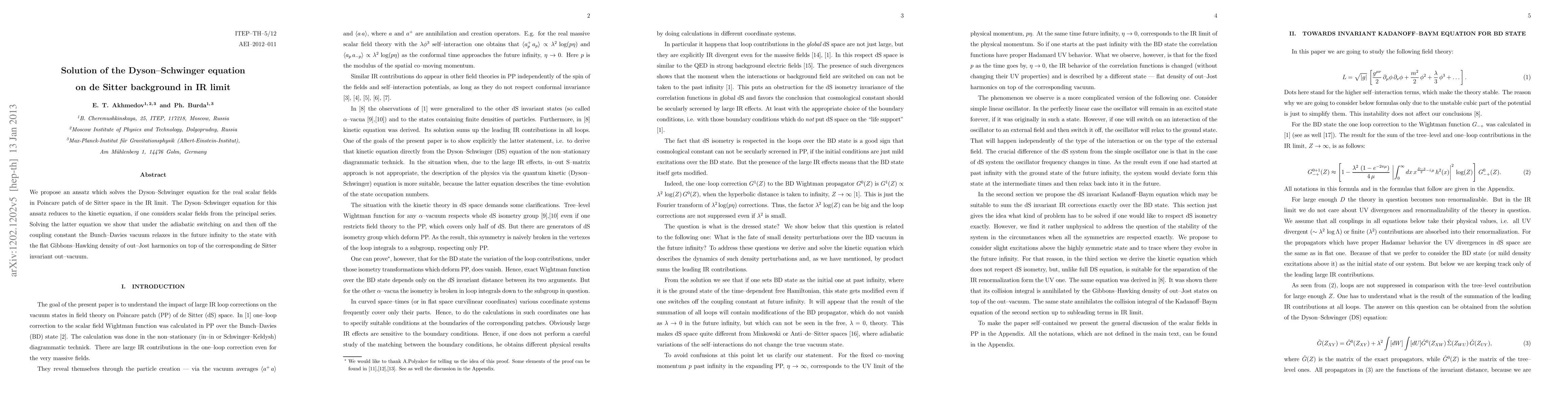 This paper proposes an ansatz to solve the Dyson-Schwinger equation for real scalar fields in de Sitter space's IR limit, showing it reduces to a kinetic equation for principal series scalar fields. The solution reveals that the Bunch-Davies vacuum transitions to a state with a flat Gibbons-Hawking density of out-Jost harmonics upon adiabatic coupling changes.