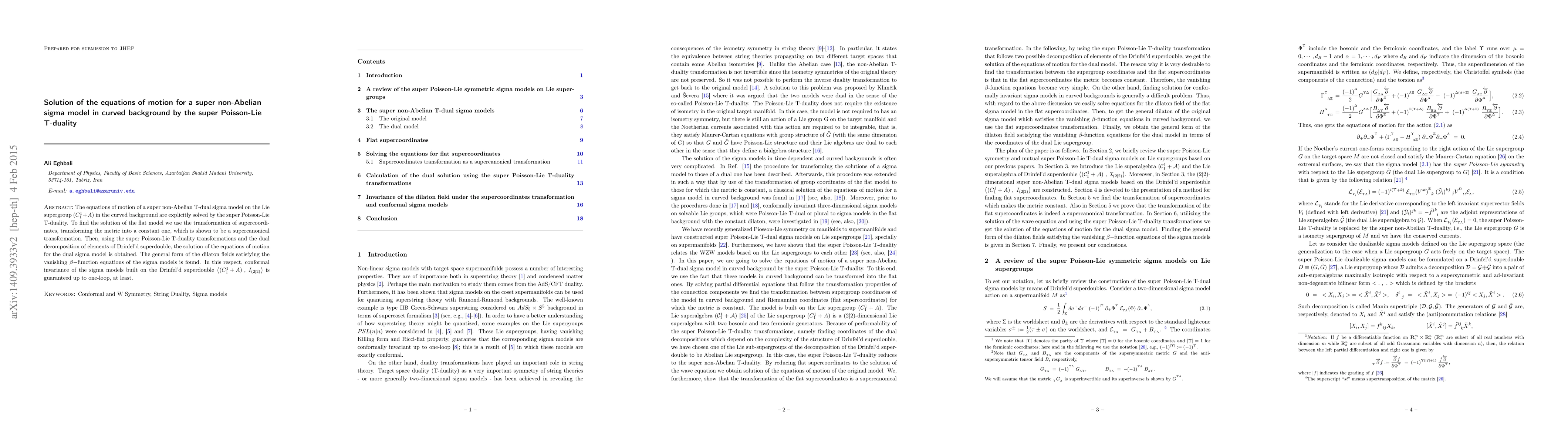 The equations of motion of a super non-Abelian T-dual sigma model on the Lie supergroup $(C^1_1+A)$ in the curved background are explicitly solved by the super Poisson-Lie T-duality. To find the solution of the flat model we use the transformation of supercoordinates, transforming the metric into a constant one, which is shown to be a supercanonical transformation. Then, using the super Poisson-Lie T-duality transformations and the dual decomposition of elements of Drinfel'd superdouble, the solution of the equations of motion for the dual sigma model is obtained. The general form of the dilaton fields satisfying the vanishing $\beta-$function equations of the sigma models is found. In this respect, conformal invariance of the sigma models built on the Drinfel'd superdouble $((C^1_1+A),I_{(2|2)})$ is guaranteed up to one-loop, at least.