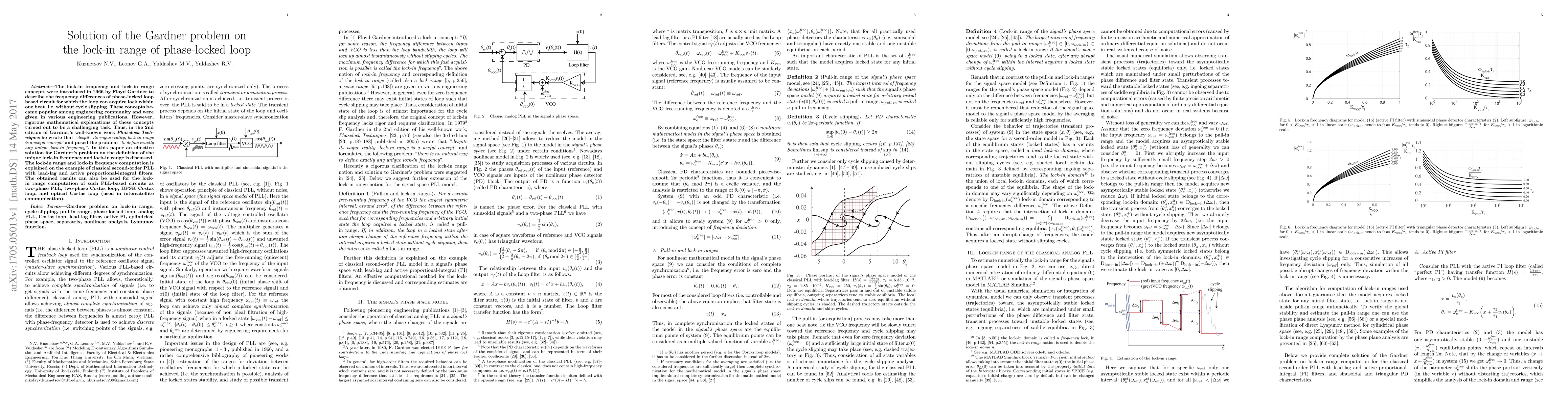 This paper provides a rigorous mathematical solution to Gardner's problem regarding the precise definition of the lock-in frequency and lock-in range in phase-locked loop circuits. It demonstrates the computation using a classical second-order PLL and extends the results to various PLL-based circuits used in intersatellite communication.