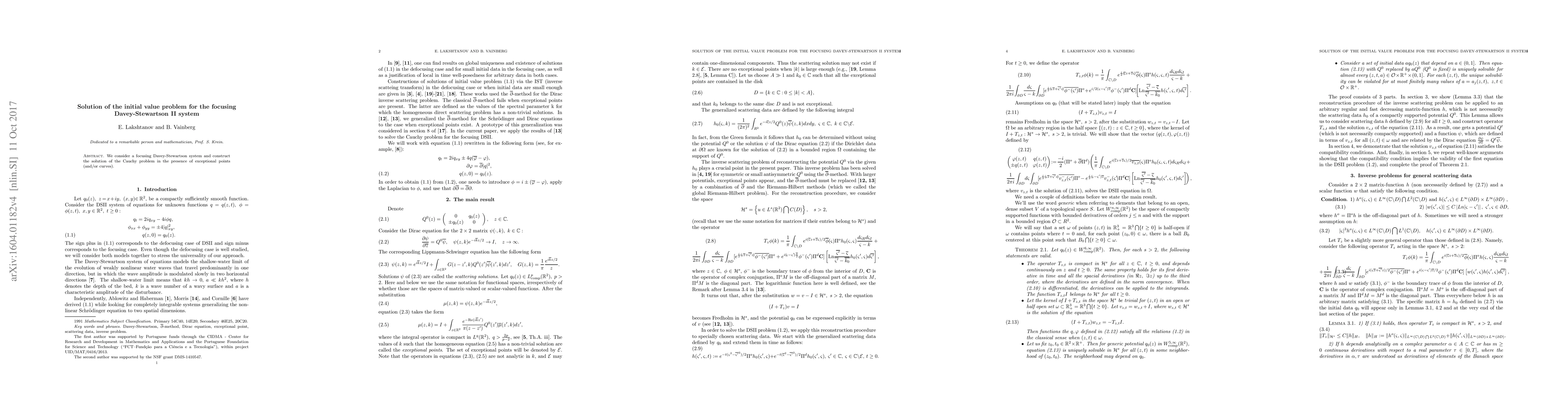 We consider a focusing Davey-Stewartson system and construct the solution of the Cauchy problem in the possible presence of exceptional points (and/or curves).