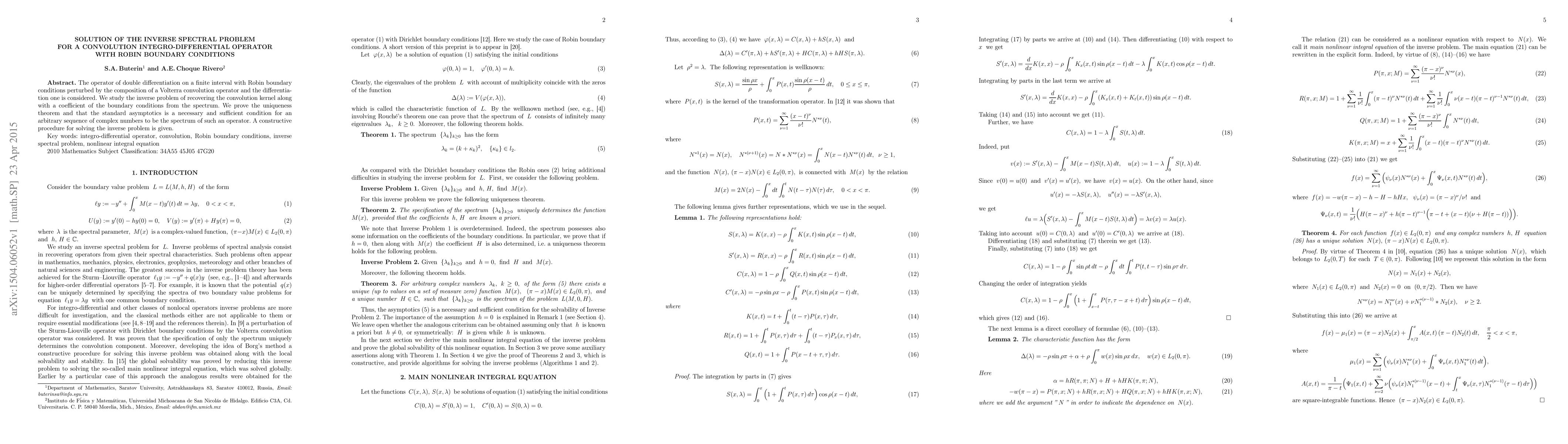 This paper addresses the inverse spectral problem for a convolution integro-differential operator with Robin boundary conditions, proving uniqueness and providing a method to recover the convolution kernel and boundary coefficient from the spectrum. The study establishes the necessary and sufficient asymptotic conditions for the spectrum.