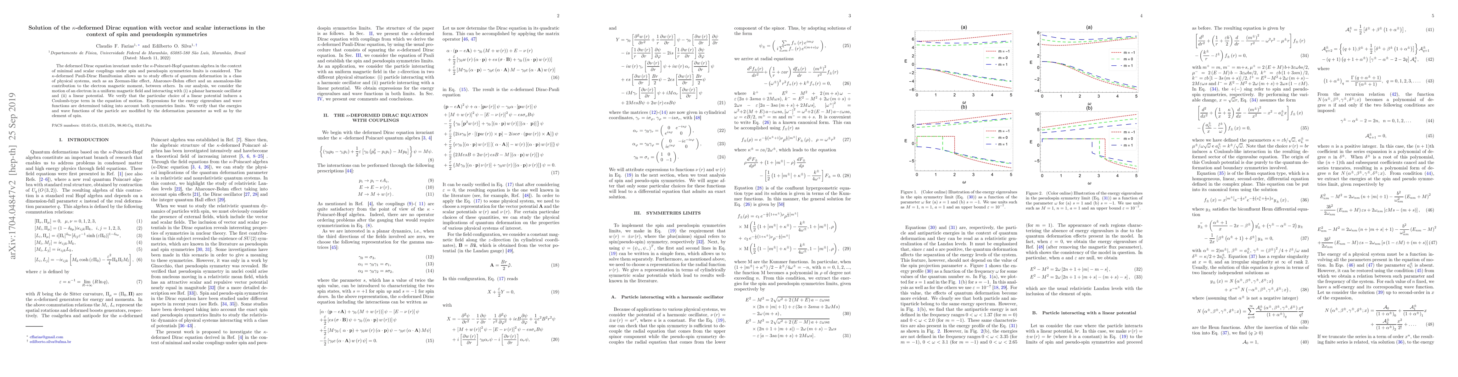 The deformed Dirac equation invariant under the $\kappa$-Poincar\'{e}-Hopf quantum algebra in the context of minimal and scalar couplings under spin and pseudospin symmetries limits is considered. The $\kappa$-deformed Pauli-Dirac Hamiltonian allows us to study effects of quantum deformation in a class of physical systems, such as an Zeeman-like effect, Aharonov-Bohm effect and an anomalous-like contribution to the electron magnetic moment, between others. In our analysis, we consider the motion of an electron in a uniform magnetic field and interacting with (i) a planar harmonic oscillator and (ii) a linear potential. We verify that the particular choice of a linear potential induces a Coulomb-type term in the equation of motion. Expressions for the energy eigenvalues and wave functions are determined taking into account both symmetries limits. We verify that the energies and wave functions of the particle are modified by the deformation parameter as well as by the element of spin.