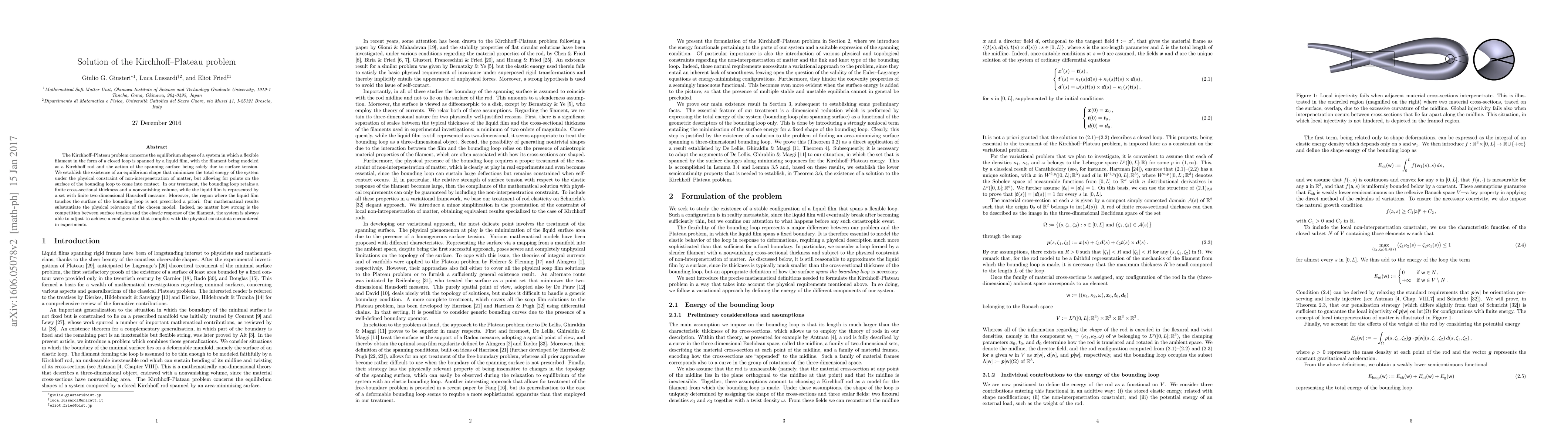 The Kirchhoff-Plateau problem concerns the equilibrium shapes of a system in which a flexible filament in the form of a closed loop is spanned by a liquid film, with the filament being modeled as a Kirchhoff rod and the action of the spanning surface being solely due to surface tension. We establish the existence of an equilibrium shape that minimizes the total energy of the system under the physical constraint of non-interpenetration of matter, but allowing for points on the surface of the bounding loop to come into contact. In our treatment, the bounding loop retains a finite cross-sectional thickness and a nonvanishing volume, while the liquid film is represented by a set with finite two-dimensional Hausdorff measure. Moreover, the region where the liquid film touches the surface of the bounding loop is not prescribed a priori. Our mathematical results substantiate the physical relevance of the chosen model. Indeed, no matter how strong is the competition between surface tension and the elastic response of the filament, the system is always able to adjust to achieve a configuration that complies with the physical constraints encountered in experiments.