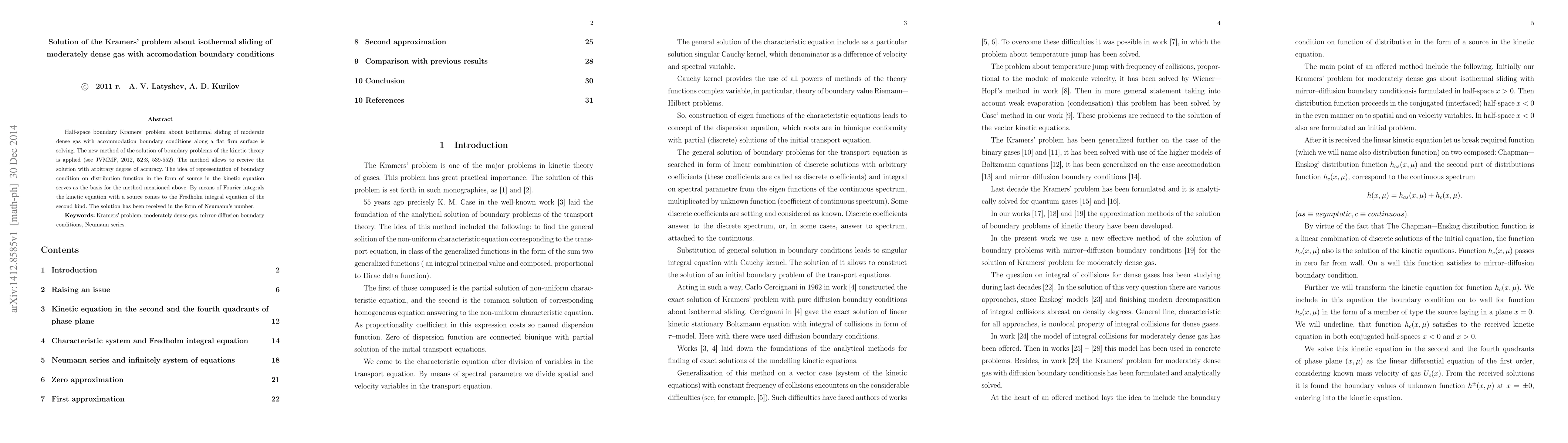 Half-space boundary Kramers' problem about isothermal sliding of moderate dense gas with accomodation boundary conditions along a flat firm surface is solving. The new method of the solution of boundary problems of the kinetic theory is applied (see JVMMF, 2012, 52:3, 539-552). The method allows to receive the solution with arbitrary degree of accuracy. The idea of representation of boundary condition on distribution function in the form of source in the kinetic equation serves as the basis for the method mentioned above. By means of Fourier integrals the kinetic equation with a source comes to the Fredholm integral equation of the second kind. The solution has been received in the form of Neumann's number.