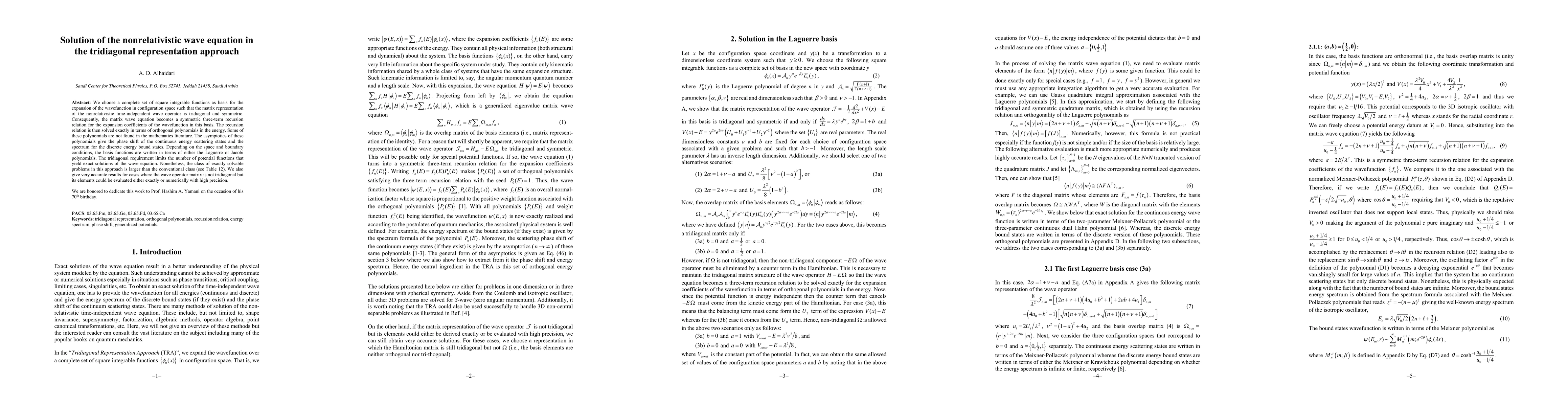 This paper presents a tridiagonal representation approach to solving the nonrelativistic wave equation, transforming it into a symmetric three-term recursion relation. The exact solution is obtained using orthogonal polynomials, some of which are newly identified, providing insights into scattering phase shifts and bound state spectra.