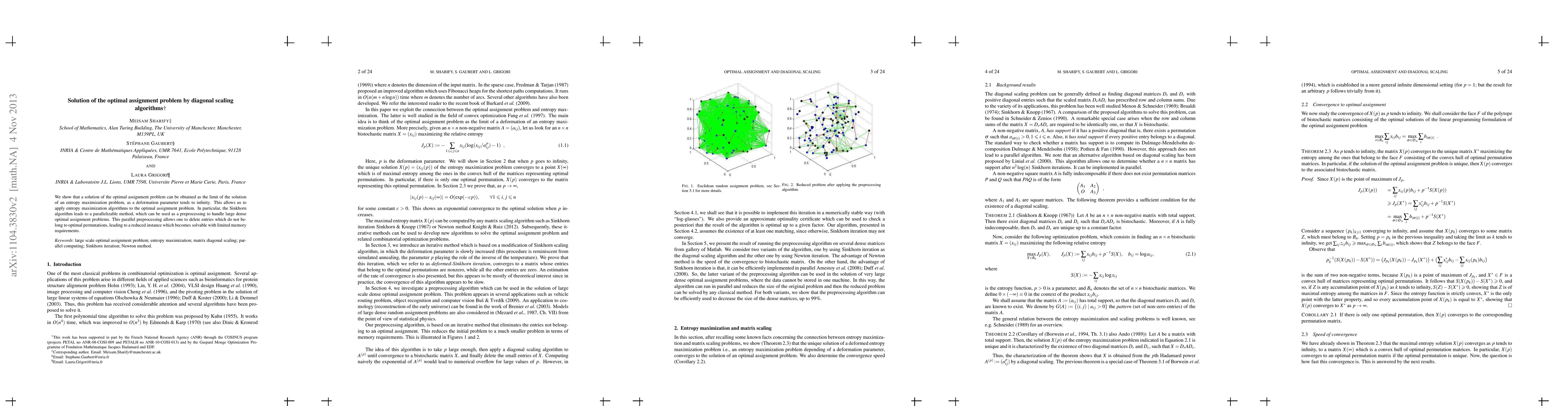 This paper proposes a solution to the optimal assignment problem using diagonal scaling algorithms, demonstrating that it can be approached as the limit of an entropy maximization problem. The Sinkhorn algorithm, applied through this method, provides a parallelizable preprocessing technique that reduces memory requirements by eliminating non-optimal entries.