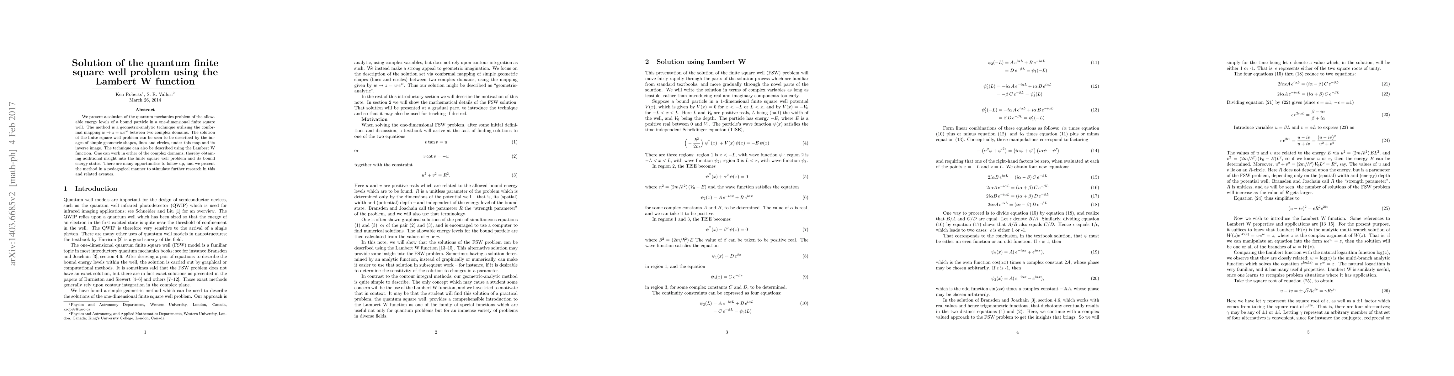 We present a solution of the quantum mechanics problem of the allowable energy levels of a bound particle in a one-dimensional finite square well. The method is a geometric-analytic technique utilizing the conformal mapping $w \to z = w e^w$ between two complex domains. The solution of the finite square well problem can be seen to be described by the images of simple geometric shapes, lines and circles, under this map and its inverse image. The technique can also be described using the Lambert W function. One can work in either of the complex domains, thereby obtaining additional insight into the finite square well problem and its bound energy states. There are many opportunities to follow up, and we present the method in a pedagogical manner to stimulate further research in this and related avenues.