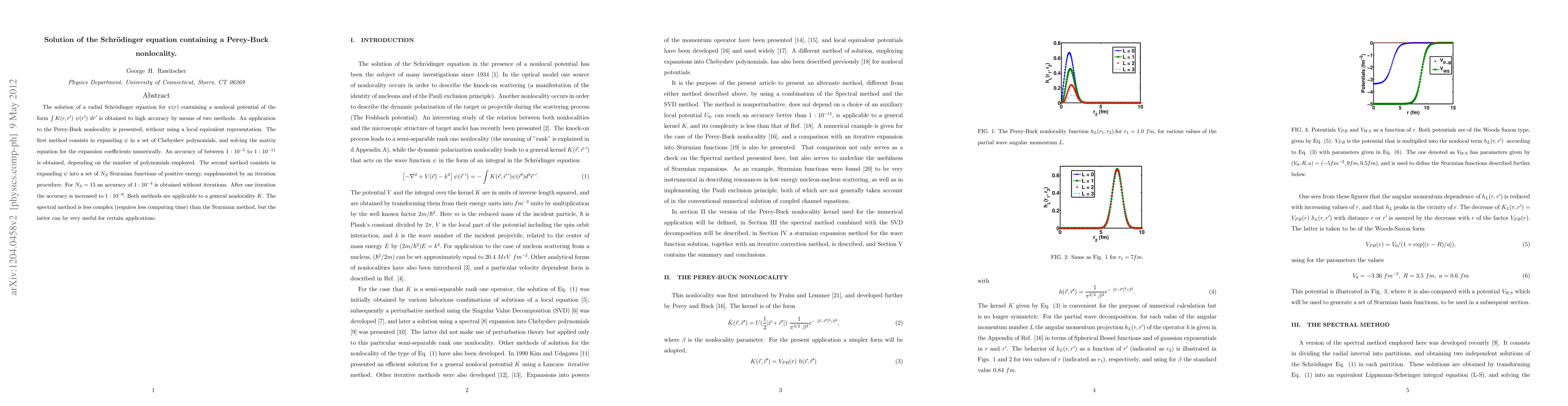 The solution of a radial Schr\"odinger equation for {\psi}(r) containing a nonlocal potential of the form \int{K(r,r') {\psi}(r') dr'} is obtained to high accuracy by means of two methods. An application to the Perey-Buck nonlocality is presented, without using a local equivalent representation. The first method consists in expanding {\psi} in a set of Chebyshev polynomials, and solving the matrix equation for the expansion coefficients numerically. An accuracy of between 1:10^{6} to 1:10^{14} is obtained, depending on the number of polynomials employed. The second method consists in expanding {\psi} into a set of N Sturmian functions of positive energy, supplemented by an iteration procedure. For N=15 an accuracy of 1:10^{4} is obtained without iterations. After one iteration the accuracy is increased to 1:10^{6}. The method is applicable to a general nonlocality K.