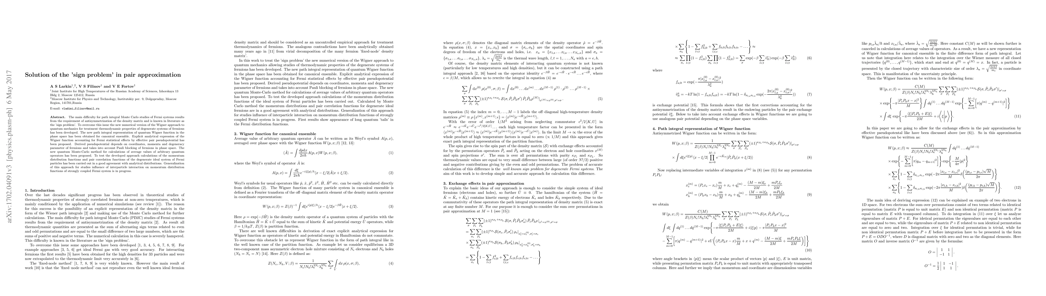 The main difficulty for path integral Monte Carlo studies of Fermi systems results from the requirement of antisymmetrization of the density matrix and is known in literature as the 'sign problem'. To overcome this issue the new numerical version of the %{\large {\tiny {\Huge }}} Wigner approach to quantum mechanics for treatment thermodynamic properties of degenerate systems of fermions has been developed. The new path integral representation of quantum Wigner function in the phase space has been obtained for canonical ensemble. Explicit analytical expression of the Wigner function accounting for Fermi statistical effects by effective pair pseudopotential has been proposed. Derived pseudopotential depends on coordinates, momenta and degeneracy parameter of fermions and takes into account Pauli blocking of fermions in phase space. The new quantum Monte-Carlo method for calculations of average values of arbitrary quantum operators has been proposed. To test the developed approach calculations of the momentum distribution function of the degenerate ideal system of Fermi particles has been carried out in a good agreement with analytical Fermi distributions. Generalization of this approach for studies influence of interparticle interaction on momentum distribution functions of strongly coupled Fermi system is in progress.