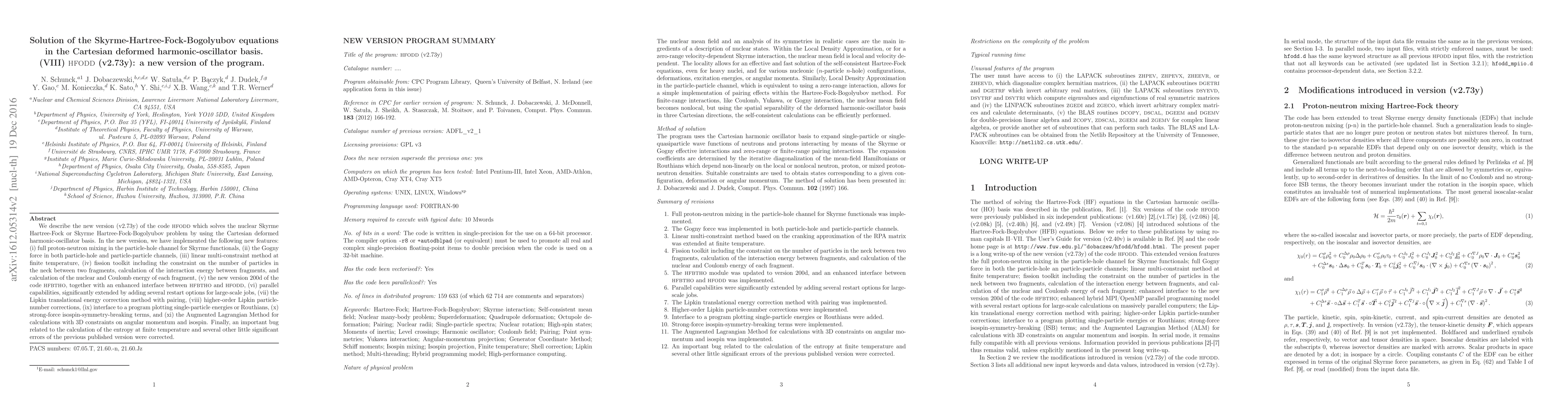 This paper introduces version 2.73y of the HFODD code, which solves nuclear Skyrme Hartree-Fock and Skyrme Hartree-Fock-Bogolyubov problems using the Cartesian deformed harmonic-oscillator basis. Key enhancements include proton-neutron mixing, Gogny force implementation, fission toolkit, parallel processing, and corrections for various bugs.