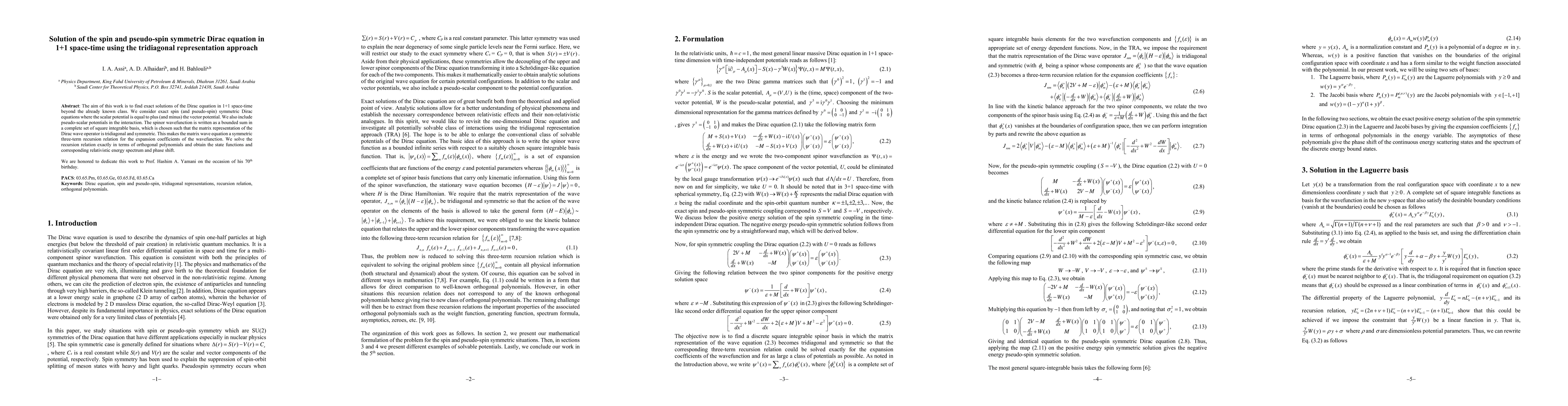 The aim of this work is to find exact solutions of the Dirac equation in 1+1 space-time beyond the already known class. We consider exact spin (and pseudo-spin) symmetric Dirac equations where the scalar potential is equal to plus (and minus) the vector potential. We also include pseudo-scalar potentials in the interaction. The spinor wavefunction is written as a bounded sum in a complete set of square integrable basis, which is chosen such that the matrix representation of the Dirac wave operator is tridiagonal and symmetric. This makes the matrix wave equation a symmetric three-term recursion relation for the expansion coefficients of the wavefunction. We solve the recursion relation exactly in terms of orthogonal polynomials and obtain the state functions and corresponding relativistic energy spectrum and phase shift.