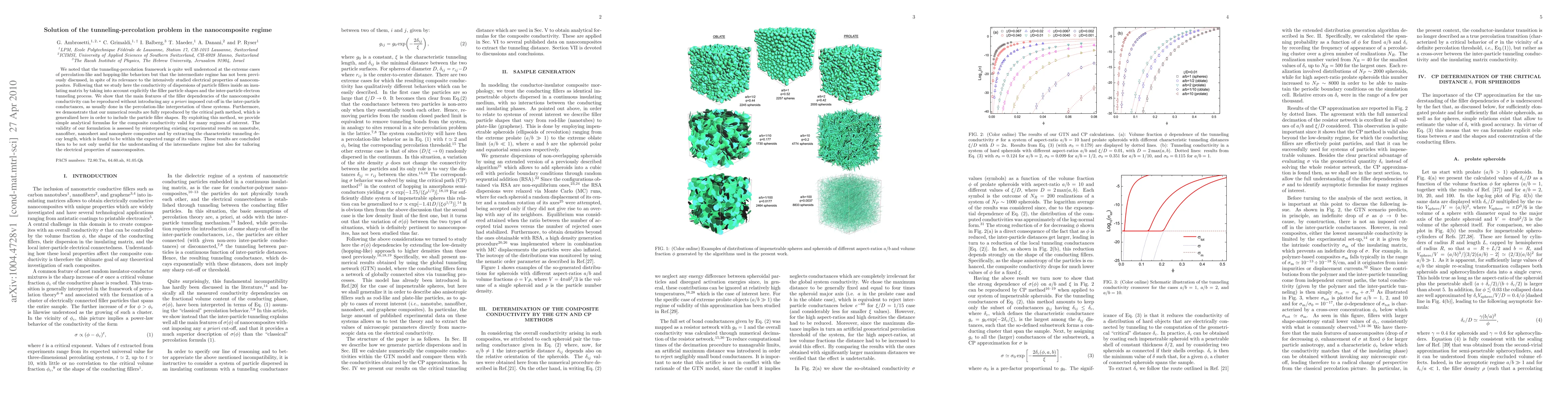 We noted that the tunneling-percolation framework is quite well understood at the extreme cases of percolation-like and hopping-like behaviors but that the intermediate regime has not been previously discussed, in spite of its relevance to the intensively studied electrical properties of nanocomposites. Following that we study here the conductivity of dispersions of particle fillers inside an insulating matrix by taking into account explicitly the filler particle shapes and the inter-particle electron tunneling process. We show that the main features of the filler dependencies of the nanocomposite conductivity can be reproduced without introducing any \textit{a priori} imposed cut-off in the inter-particle conductances, as usually done in the percolation-like interpretation of these systems. Furthermore, we demonstrate that our numerical results are fully reproduced by the critical path method, which is generalized here in order to include the particle filler shapes. By exploiting this method, we provide simple analytical formulas for the composite conductivity valid for many regimes of interest. The validity of our formulation is assessed by reinterpreting existing experimental results on nanotube, nanofiber, nanosheet and nanosphere composites and by extracting the characteristic tunneling decay length, which is found to be within the expected range of its values. These results are concluded then to be not only useful for the understanding of the intermediate regime but also for tailoring the electrical properties of nanocomposites.