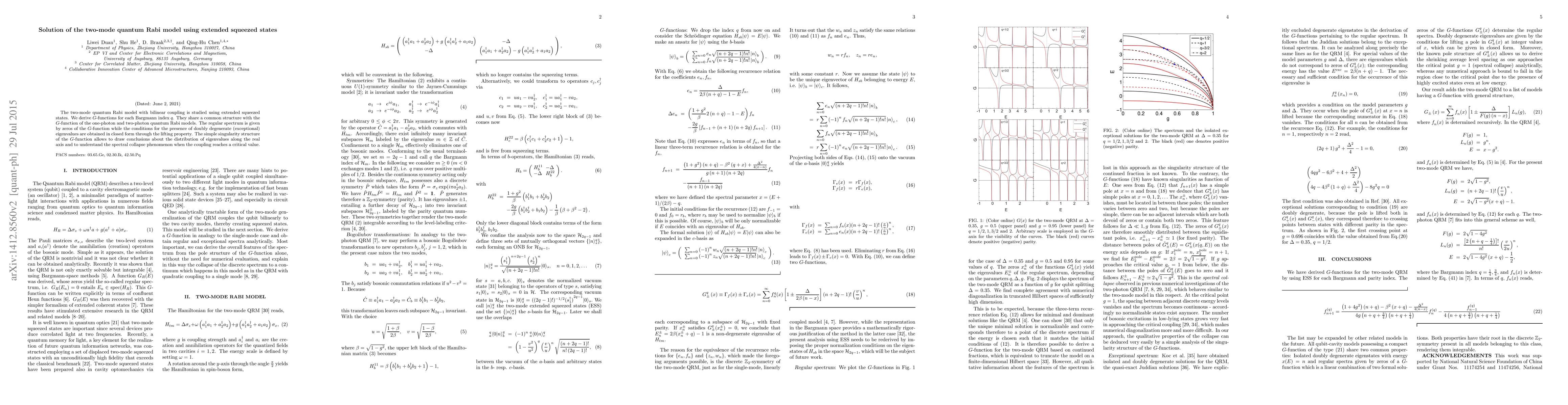 The two-mode quantum Rabi model with bilinear coupling is studied using extended squeezed states. We derive $G$-functions for each Bargmann index $q$% . They share a common structure with the $G$-function of the one-photon and two-photon quantum Rabi models. The regular spectrum is given by zeros of the $G$-function while the conditions for the presence of doubly degenerate (exceptional) eigenvalues are obtained in closed form through the lifting property. The simple singularity structure of the $G$-function allows to draw conclusions about the distribution of eigenvalues along the real axis and to understand the spectral collapse phenomenon when the coupling reaches a critical value.