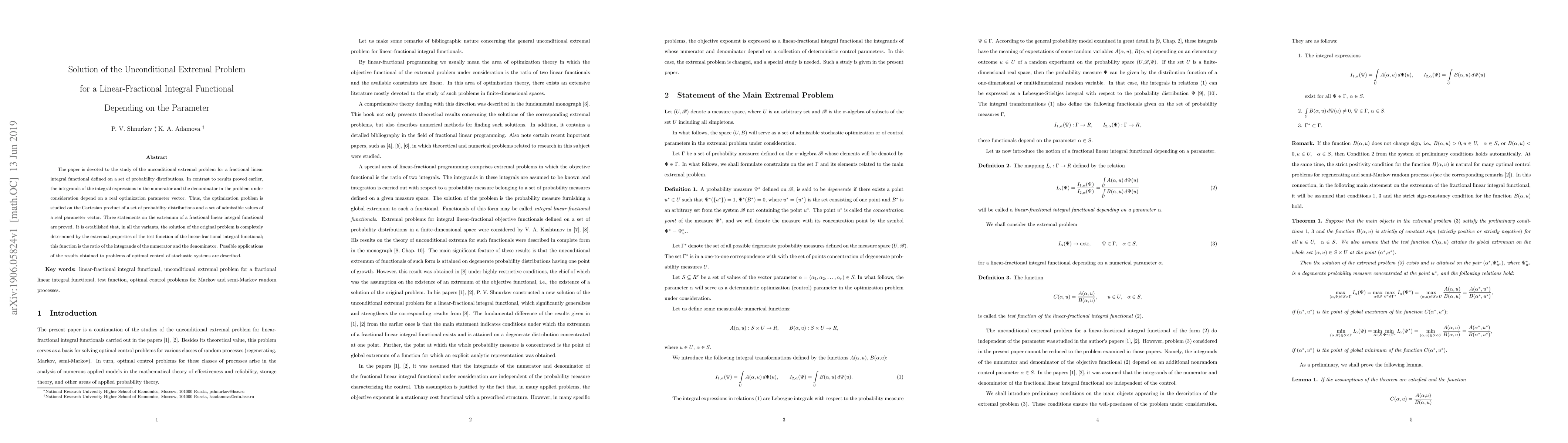 This paper addresses the unconditional extremal problem for a linear-fractional integral functional with integrands dependent on a real parameter vector. It proves three statements on the extremum, showing that the solution is determined by the extremal properties of a test function, and discusses potential applications to optimal control of stochastic systems.