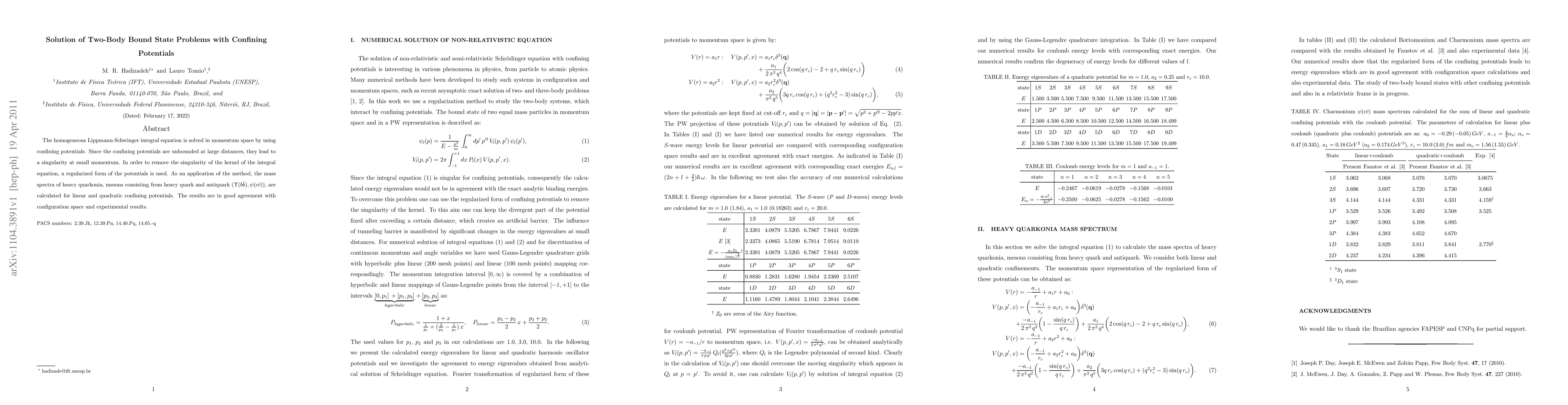 This paper solves the Lippmann-Schwinger integral equation in momentum space using confining potentials to address two-body bound state problems, regularizing the singularity to obtain accurate results. The method is applied to calculate the mass spectra of heavy quarkonia, showing good agreement with both theoretical and experimental data.