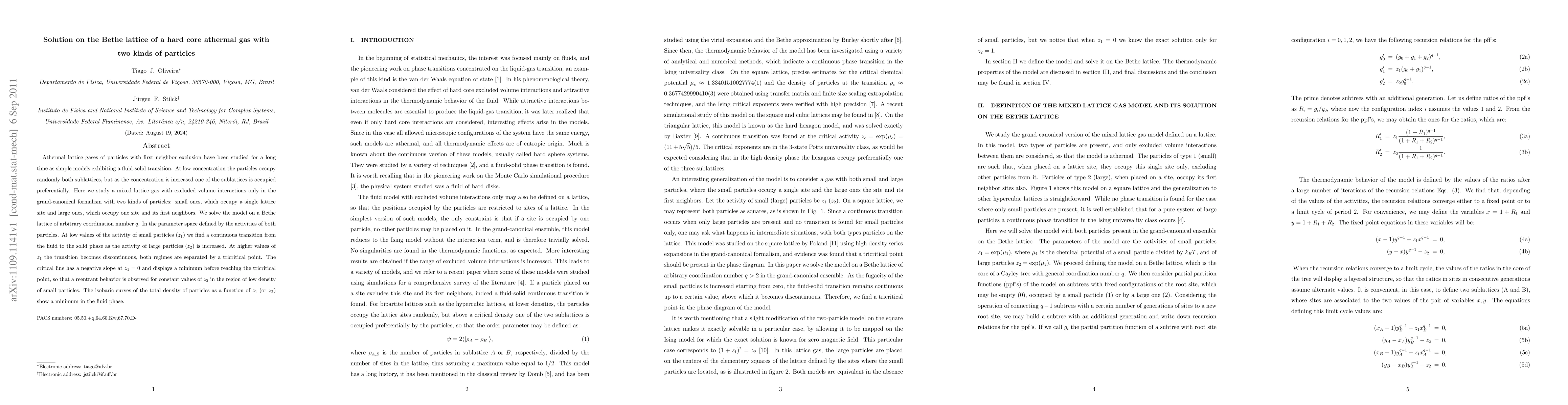 Athermal lattice gases of particles with first neighbor exclusion have been studied for a long time as simple models exhibiting a fluid-solid transition. At low concentration the particles occupy randomly both sublattices, but as the concentration is increased one of the sublattices is occupied preferentially. Here we study a mixed lattice gas with excluded volume interactions only in the grand-canonical formalism with two kinds of particles: small ones, which occupy a single lattice site and large ones, which occupy one site and its first neighbors. We solve the model on a Bethe lattice of arbitrary coordination number $q$. In the parameter space defined by the activities of both particles. At low values of the activity of small particles ($z_1$) we find a continuous transition from the fluid to the solid phase as the activity of large particles ($z_2$) is increased. At higher values of $z_1$ the transition becomes discontinuous, both regimes are separated by a tricritical point. The critical line has a negative slope at $z_1=0$ and displays a minimum before reaching the tricritical point, so that a reentrant behavior is observed for constant values of $z_2$ in the region of low density of small particles. The isobaric curves of the total density of particles as a function of $z_1$ (or $z_2$) show a minimum in the fluid phase.
