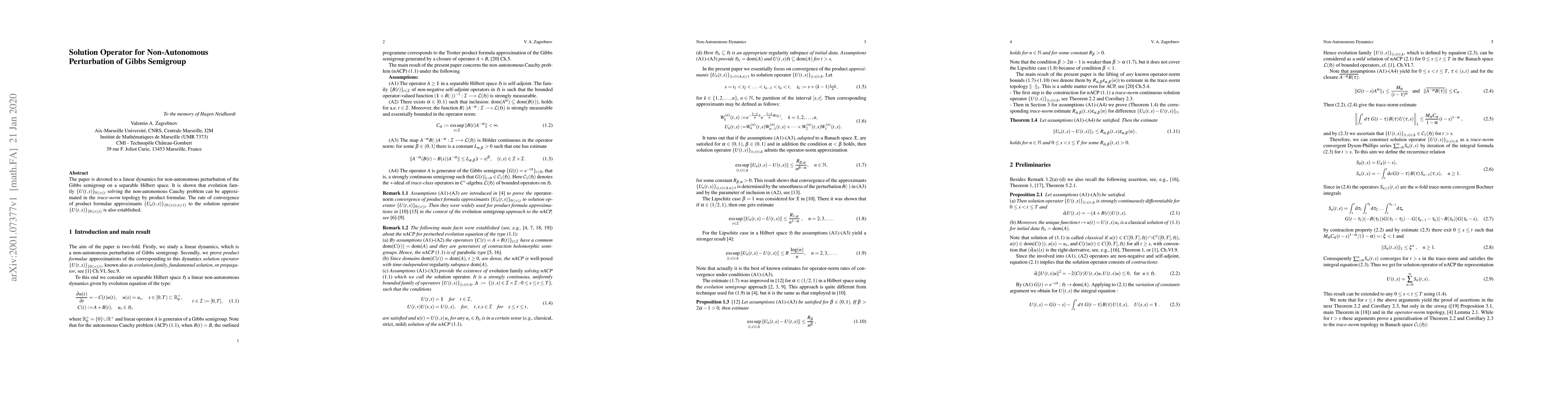 The paper is devoted to a linear dynamics for non-autonomous perturbation of the Gibbs semigroup on a separable Hilbert space. It is shown that evolution family {U(t, s)} 0$\le$s$\le$t solving the non-autonomous Cauchy problem can be approximated in the trace-norm topology by product formulae. The rate of convergence of product formulae approximants {U n (t, s)} {0$\le$s$\le$t,n$\ge$1} to the solution operator {U(t, s)} {0$\le$s$\le$t} is also established.