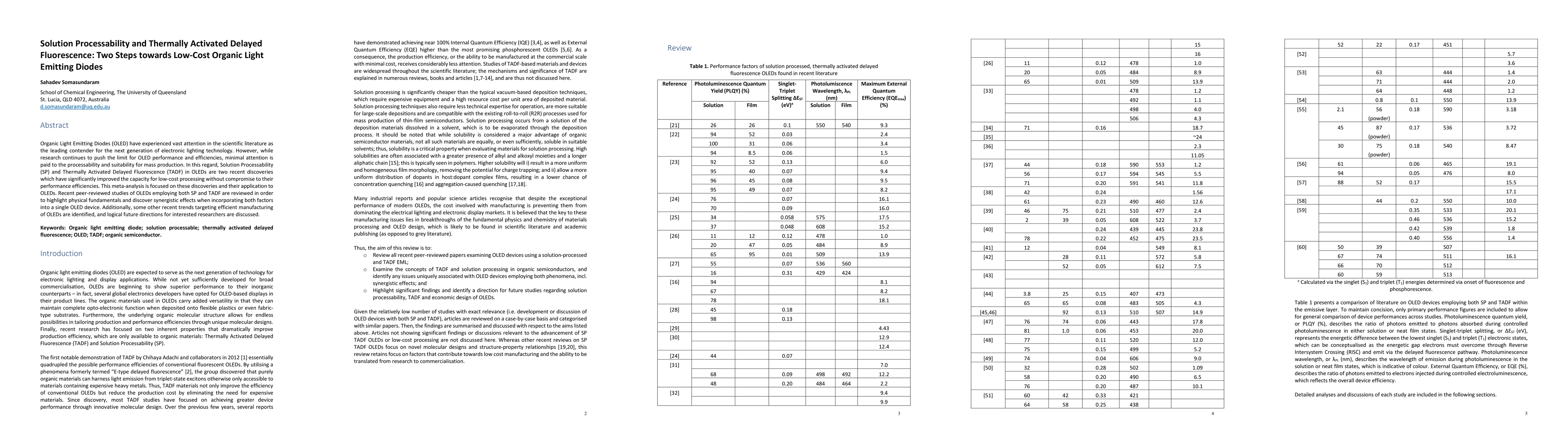 This paper reviews the advancements in Solution Processability and Thermally Activated Delayed Fluorescence in Organic Light Emitting Diodes (OLEDs), emphasizing their potential to enhance low-cost manufacturing while maintaining performance efficiency. It synthesizes recent findings to identify synergistic effects and proposes future research directions for efficient OLED production.