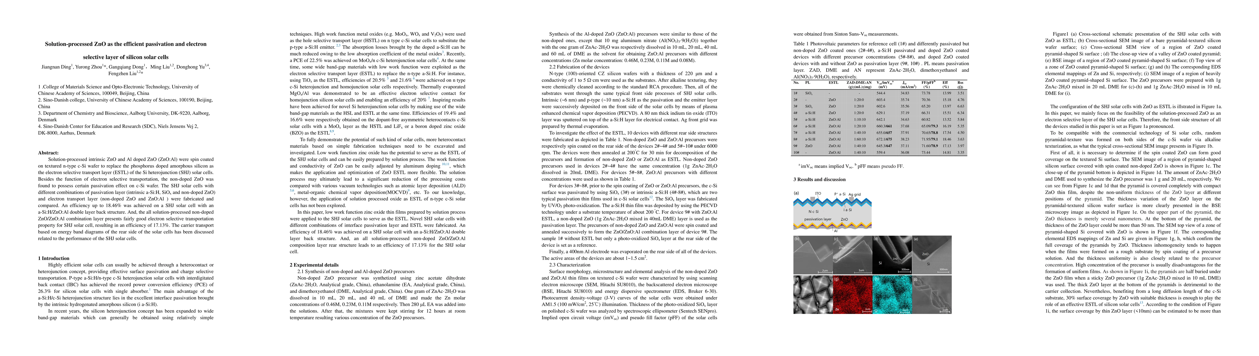 Solution-processed intrinsic ZnO and Al doped ZnO (ZnO:Al) were spin coated on textured n-type c-Si wafer to replace the phosphorus doped amorphous silicon as the electron selective transport layer (ESTL) of the Si heterojunction (SHJ) solar cells. Besides the function of electron selective transportation, the non-doped ZnO was found to possess certain passivation effect on c-Si wafer. The SHJ solar cells with different combinations of passivation layer (intrinsic a-Si:H, SiOx and non-doped ZnO) and electron transport layer (non-doped ZnO and ZnO:Al ) were fabricated and compared. An efficiency up to 18.46% was achieved on a SHJ solar cell with an a-Si:H/ZnO:Al double layer back structure. And, the all solution-processed non-doped ZnO/ZnO:Al combination layer presents fairly good electron selective transportation property for SHJ solar cell, resulting in an efficiency of 17.13%. The carrier transport based on energy band diagrams of the rear side of the solar cells has been discussed related to the performance of the SHJ solar cells.