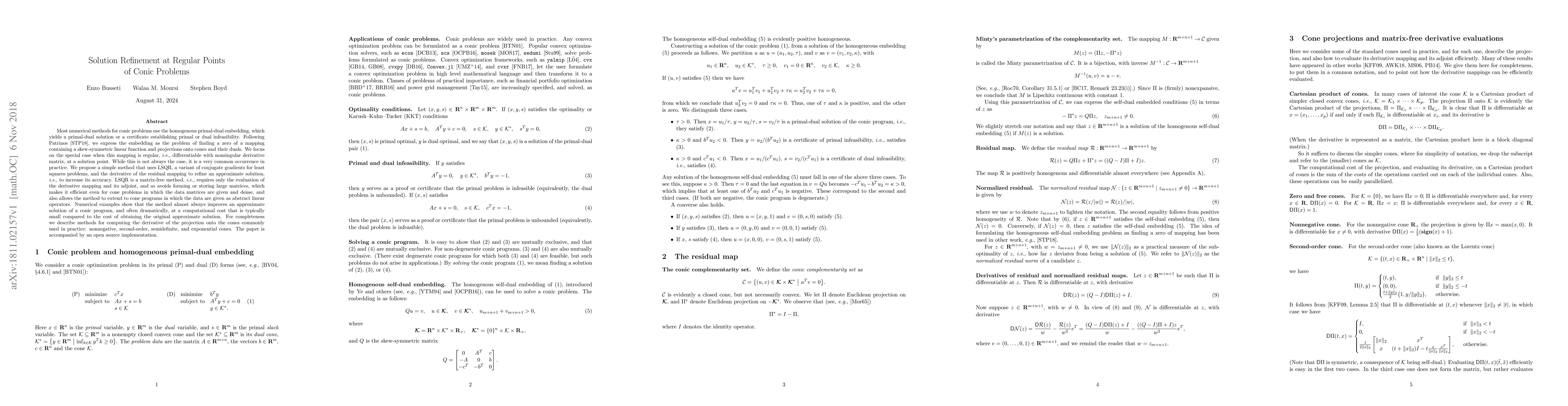Most numerical methods for conic problems use the homogenous primal-dual embedding, which yields a primal-dual solution or a certificate establishing primal or dual infeasibility. Following Patrinos (and others, 2018), we express the embedding as the problem of finding a zero of a mapping containing a skew-symmetric linear function and projections onto cones and their duals. We focus on the special case when this mapping is regular, i.e., differentiable with nonsingular derivative matrix, at a solution point. While this is not always the case, it is a very common occurrence in practice. We propose a simple method that uses LSQR, a variant of conjugate gradients for least squares problems, and the derivative of the residual mapping to refine an approximate solution, i.e., to increase its accuracy. LSQR is a matrix-free method, i.e., requires only the evaluation of the derivative mapping and its adjoint, and so avoids forming or storing large matrices, which makes it efficient even for cone problems in which the data matrices are given and dense, and also allows the method to extend to cone programs in which the data are given as abstract linear operators. Numerical examples show that the method almost always improves an approximate solution of a conic program, and often dramatically, at a computational cost that is typically small compared to the cost of obtaining the original approximate solution. For completeness we describe methods for computing the derivative of the projection onto the cones commonly used in practice: nonnegative, second-order, semidefinite, and exponential cones. The paper is accompanied by an open source implementation.
