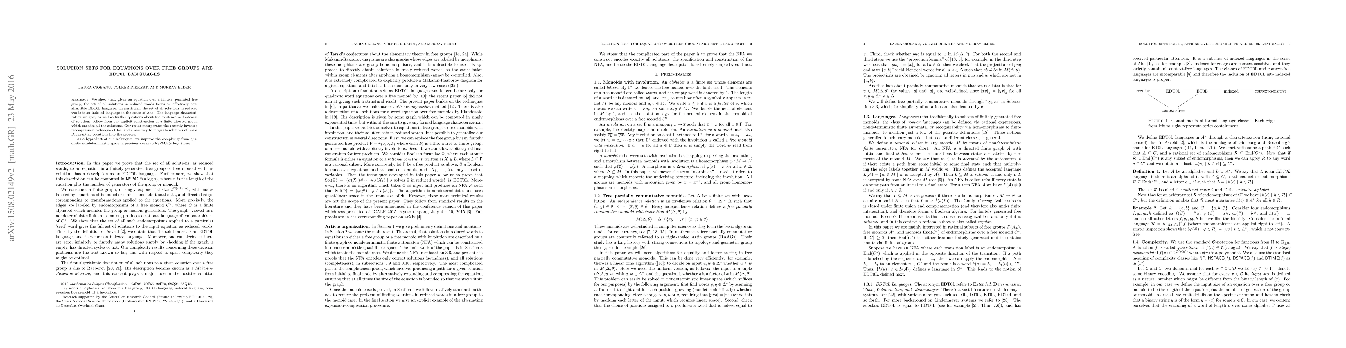 Research shows that solutions to equations over free groups form an effectively constructible EDT0L language, with implications for solving such equations in efficient computational space.