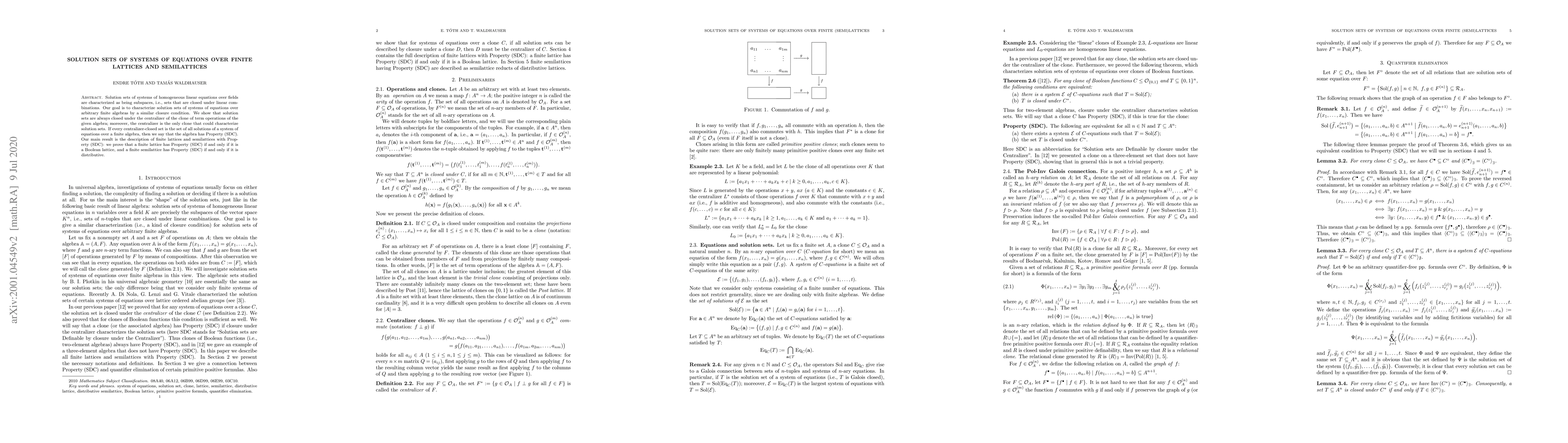 Solution sets of systems of homogeneous linear equations over fields are characterized as being subspaces, i.e., sets that are closed under linear combinations. Our goal is to characterize solution sets of systems of equations over arbitrary finite algebras by a similar closure condition. We show that solution sets are always closed under the centralizer of the clone of term operations of the given algebra; moreover, the centralizer is the only clone that could characterize solution sets. If every centralizer-closed set is the set of all solutions of a system of equations over a finite algebra, then we say that the algebra has Property (SDC). Our main result is the description of finite lattices and semilattices with Property (SDC): we prove that a finite lattice has Property (SDC) if and only if it is a Boolean lattice, and a finite semilattice has Property (SDC) if and only if it is distributive.