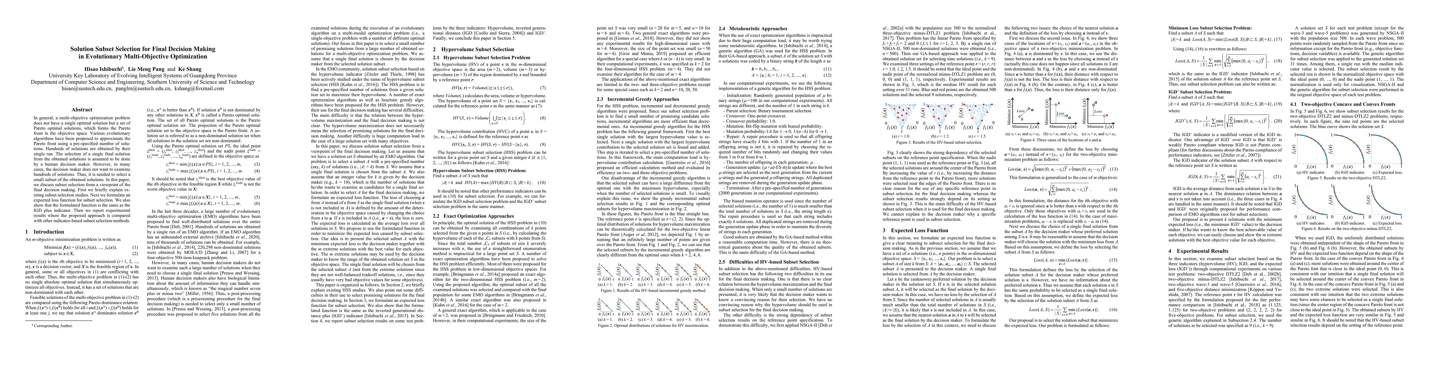 This paper discusses methods for selecting a small subset of optimal solutions from a large set obtained by evolutionary multi-objective optimization algorithms, focusing on aiding final decision making. It formulates an expected loss function for subset selection and compares its effectiveness with other indicator-based methods through experiments.