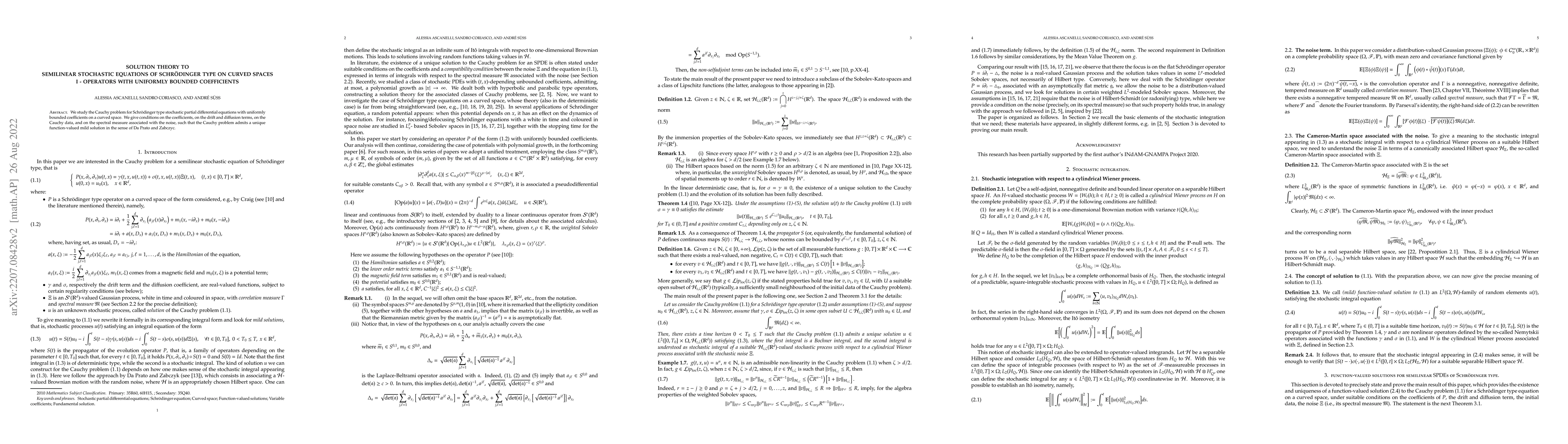 This paper investigates the Cauchy problem for stochastic Schrödinger-type partial differential equations on curved spaces with uniformly bounded coefficients, establishing conditions for the existence and uniqueness of a mild solution in the framework of Da Prato and Zabczyk.