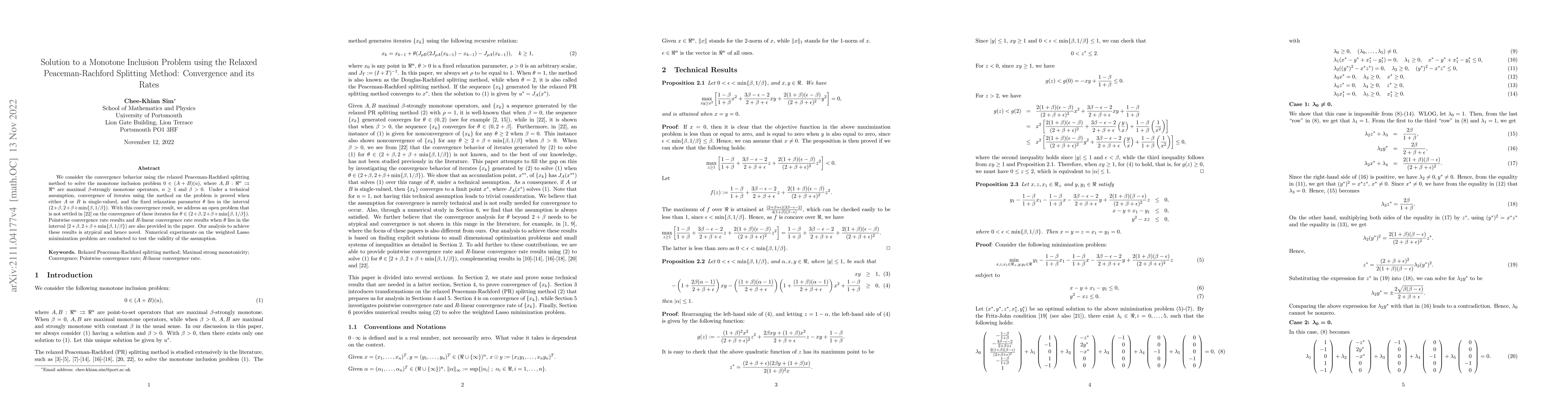 This paper proves the convergence and convergence rates of the relaxed Peaceman-Rachford splitting method for solving the monotone inclusion problem $0 \in (A + B)(u)$, under specific conditions on the operators $A$ and $B$. It also provides novel pointwise and $R$-linear convergence rate results and tests the method on the weighted Lasso minimization problem.