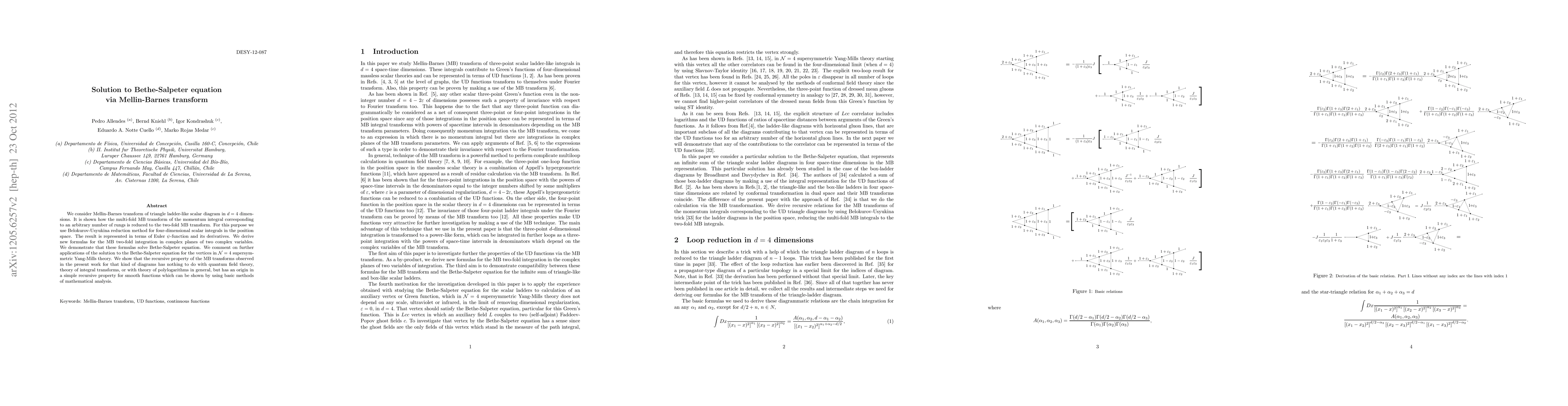 We consider Mellin-Barnes transform of triangle ladder-like scalar diagram in d=4 dimensions. It is shown how the multi-fold MB transform of the momentum integral corresponding to an arbitrary number of rungs is reduced to the two-fold MB transform. For this purpose we use Belokurov-Usyukina reduction method for four-dimensional scalar integrals in the position space. The result is represented in terms of Euler psi-function and its derivatives. We derive new formulas for the MB two-fold integration in complex planes of two complex variables. We demonstrate that these formulas solve Bethe-Salpeter equation. We comment on further applications of the solution to the Bethe-Salpeter equation for the vertices in N=4 supersymmetric Yang-Mills theory. We show that the recursive property of the MB transforms observed in the present work for that kind of diagrams has nothing to do with quantum field theory, theory of integral transforms, or with theory of polylogarithms in general, but has an origin in a simple recursive property for smooth functions which can be shown by using basic methods of mathematical analysis.