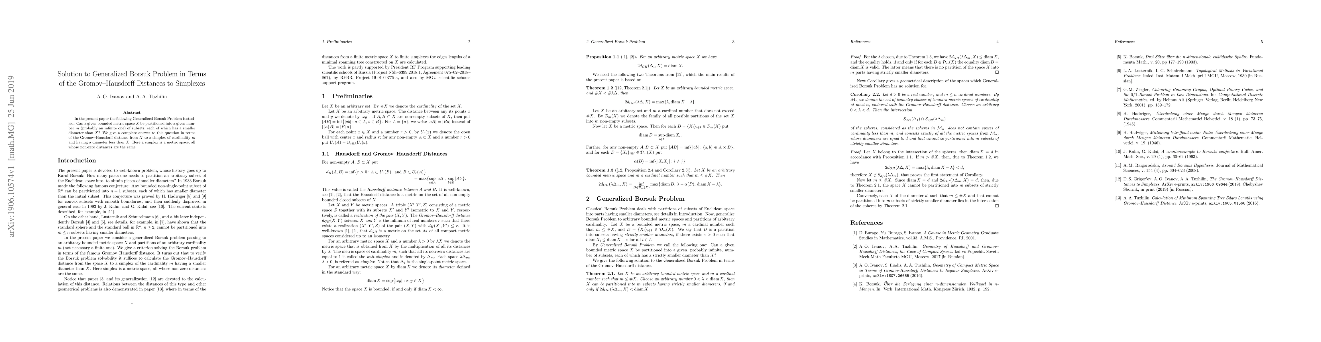 This paper provides a solution to the Generalized Borsuk Problem by determining if a bounded metric space $X$ can be partitioned into $m$ subsets with smaller diameters, using the Gromov-Hausdorff distance to simplexes of cardinality $m$ with diameters less than $X$.