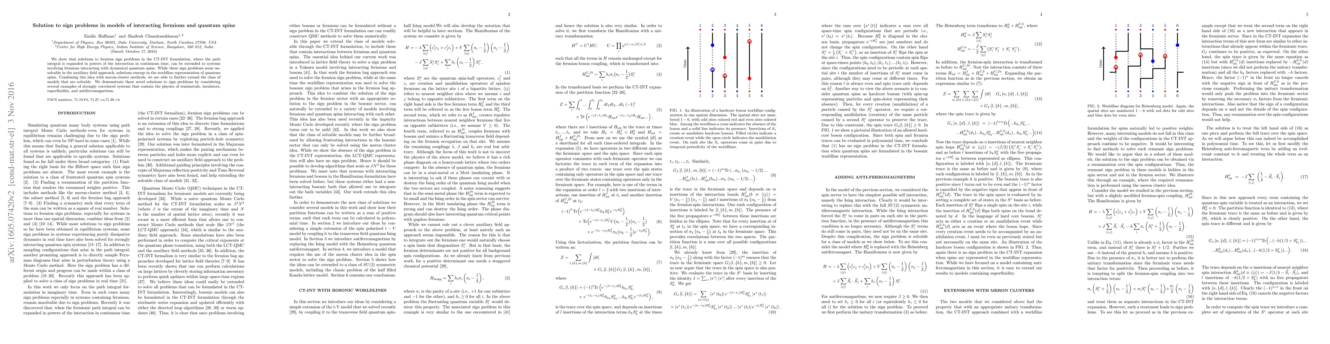 We show that solutions to fermion sign problems in the CT-INT formulation can be extended to systems involving fermions interacting with dynamical quantum spins. While these sign problems seem unsolvable in the auxiliary field approach, solutions emerge in the worldline representation of quantum spins. Combining the idea with meron-cluster methods, we are able to extend the solvable models even further. We demonstrate these novel solutions to sign problems by considering several examples of strongly correlated systems.