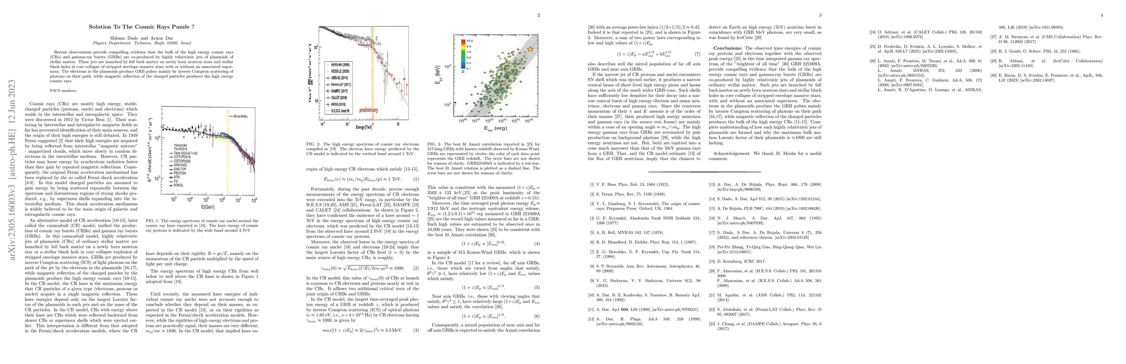 Recent observations provide compelling evidence that the bulk of the high energy cosmic rays (CRs) and gamma-ray bursts (GRBs) are co-produced by highly relativistic jets of plasmoids of stellar matter. These jets are launched by fall back matter on newly born neutron stars and stellar black holes in core collapse of stripped envelope massive stars with or without an associated supernova. The electrons in the plasmoids produce GRB pulses mainly by inverse Compton scattering of photons on their path, while magnetic reflection of the charged particles produces the high energy cosmic rays.