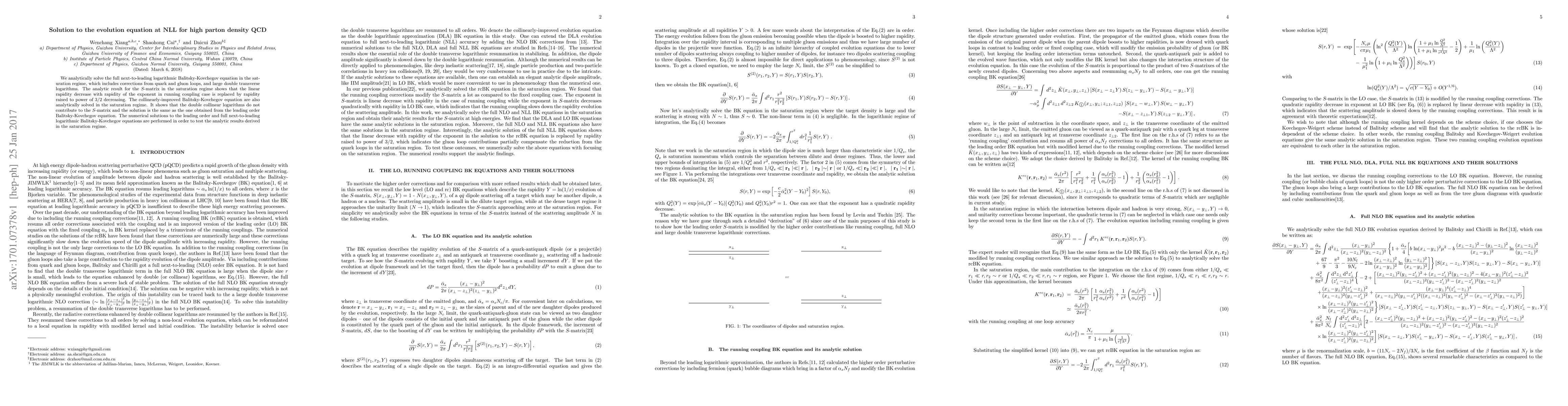 We analytically solve the full next-to-leading logarithmic Balitsky-Kovchegov equation in the saturation regime, which includes corrections from quark and gluon loops, and large double transverse logarithms. The analytic result for the $S$-matrix in the saturation regime shows that the linear rapidity decrease with rapidity of the exponent in running coupling case is replaced by rapidity raised to power of 3/2 decreasing. The collinearly-improved Balitsky-Kovchegov equation are also analytically solved in the saturation regime. It shows that the double collinear logarithms do not contribute to the $S$-matrix and the solution is the same as the one obtained from the leading order Balitsky-Kovchegov equation. The numerical solutions to the leading order and full next-to-leading logarithmic Balitsky-Kovchegov equations are performed in order to test the analytic results derived in the saturation regime.