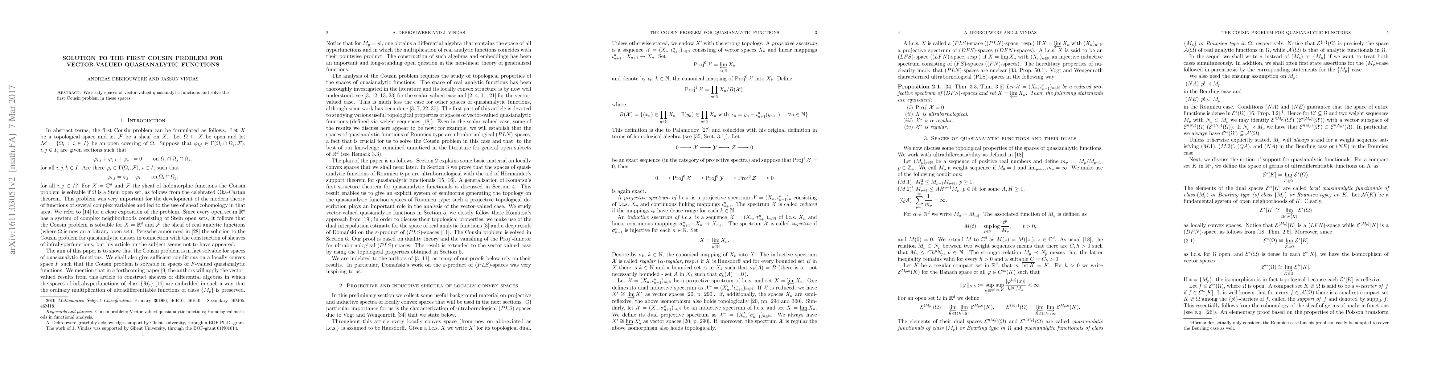 This paper solves the first Cousin problem for vector-valued quasianalytic functions in specific spaces, a significant advancement in functional analysis.
