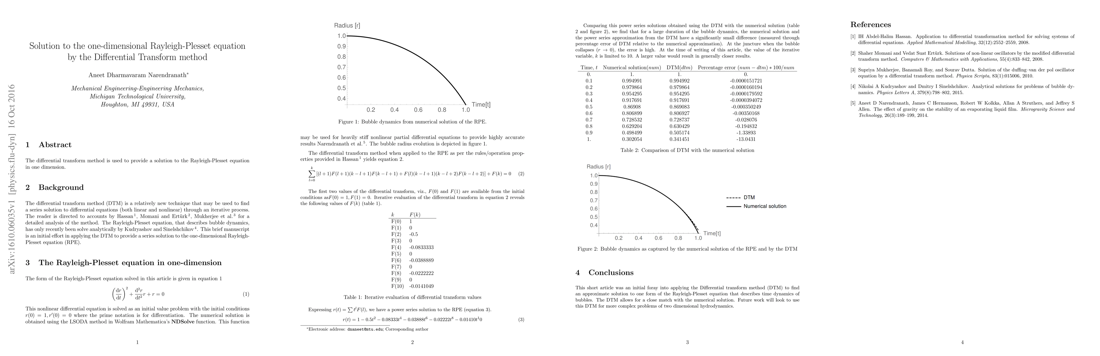 The differential transform method (DTM) is a relatively new technique that may be used to find a series solution to differential equations (both linear and nonlinear) through an iterative process. This brief manuscript is an initial effort in applying the DTM to provide a series solution to the one-dimensional Rayleigh-Plesset equation (RPE).