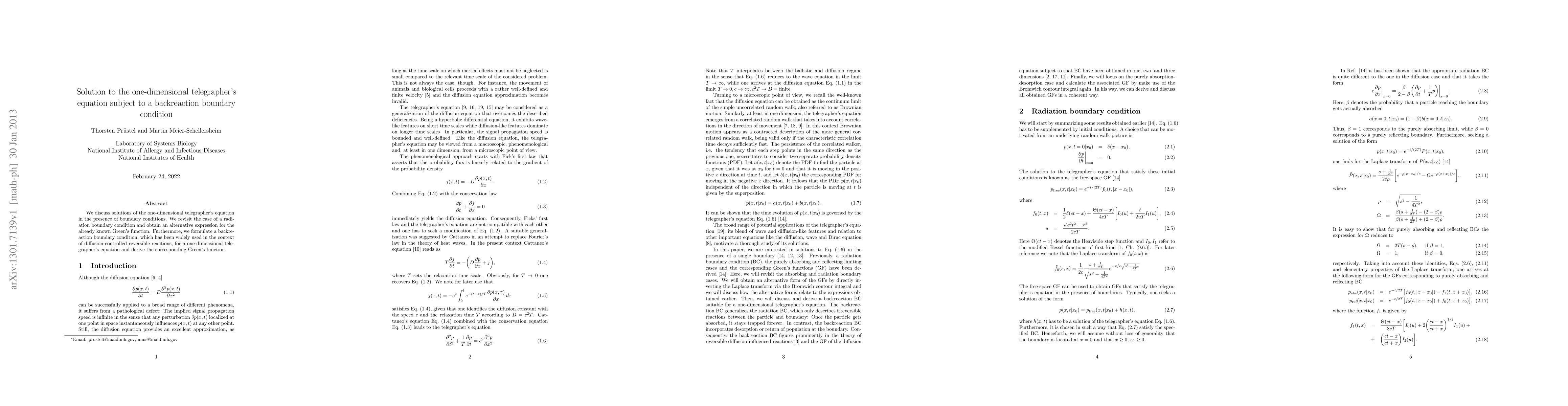 This paper revisits solutions to the one-dimensional telegrapher's equation under radiation boundary conditions, providing an alternative expression for the Green's function. It also introduces a backreaction boundary condition and derives the corresponding Green's function for this new condition.