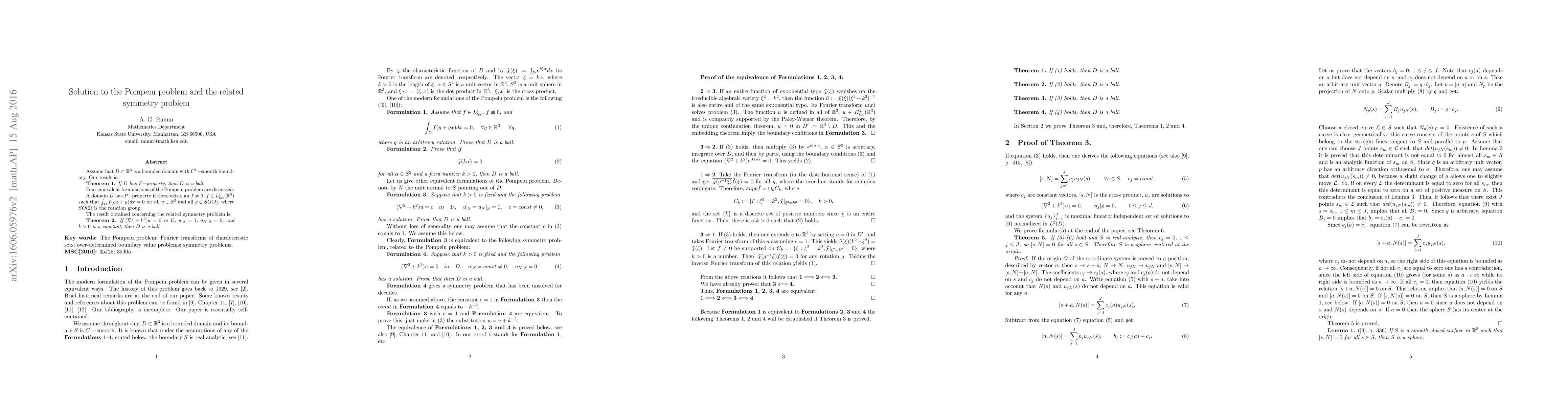 Researchers solve the Pompeiu problem, showing that a domain with certain symmetry properties is always a ball, and apply this result to another related problem involving Laplace equations in 3D domains.