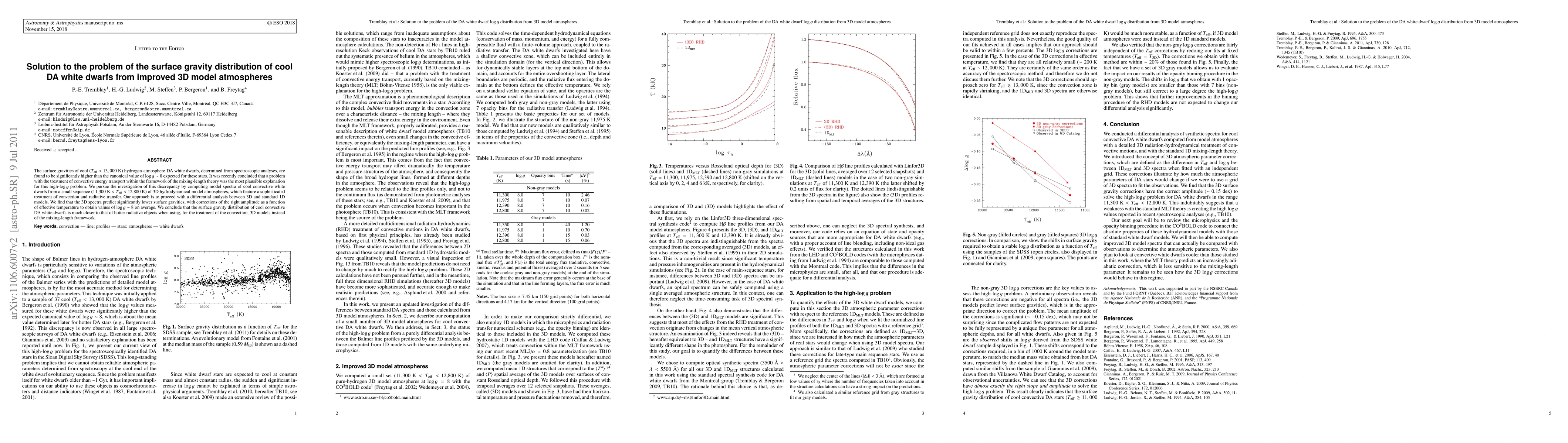 This paper addresses the discrepancy in surface gravity measurements for cool DA white dwarfs, finding that 3D model atmospheres with improved convective treatment predict lower surface gravities, resolving the high-log g issue and aligning with canonical values.