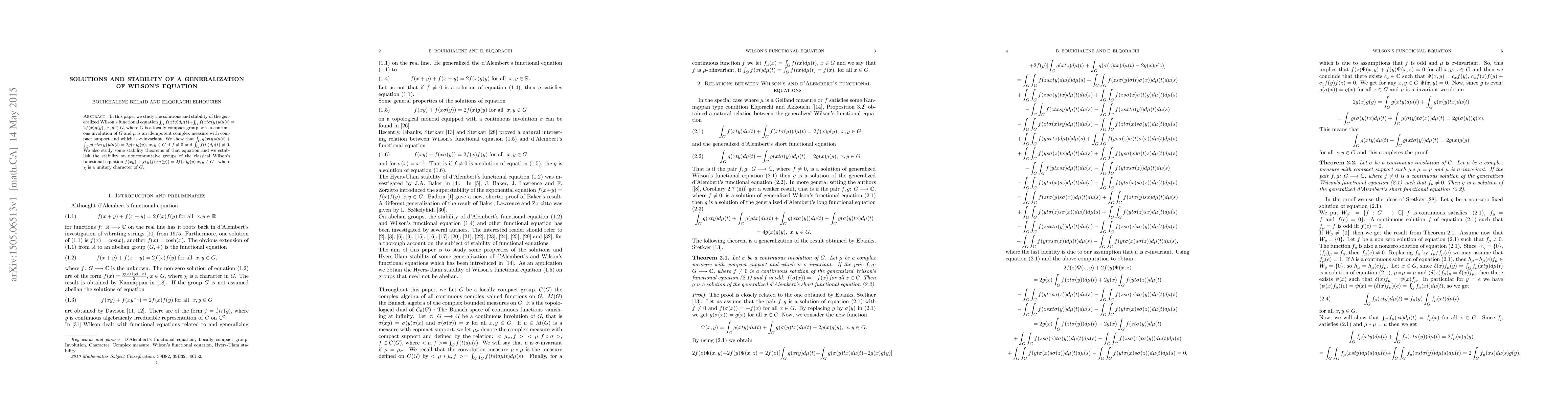 This paper investigates solutions and stability for a generalized version of Wilson's functional equation within the context of locally compact groups. It proves the existence of solutions and stability for the equation under specific conditions, extending classical Wilson's equation to noncommutative groups.