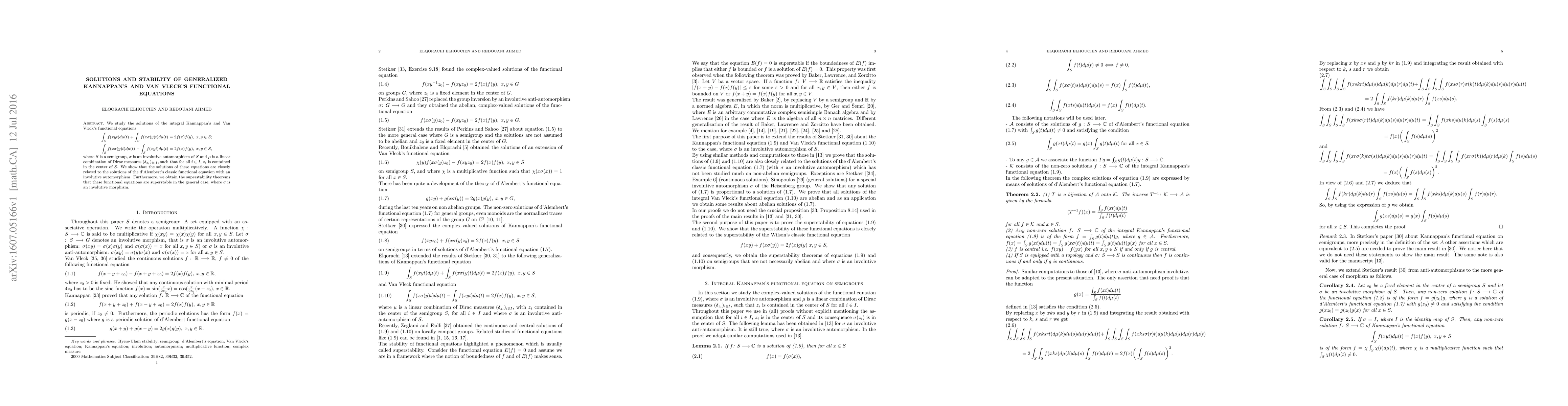 We study the solutions of the integral Kannappan's and Van Vleck's functional equations $$\int_{S}f(xyt)d\mu(t)+\int_{S}f(x\sigma(y)t)d\mu(t) = 2f(x)f(y), \;x,y\in S;$$ $$\int_{S}f( x\sigma(y)t)d\mu(t)-\int_{S}f(xyt)d\mu(t) = 2f(x)f(y), \;x,y\in S,$$ where $S$ is a semigroup, $\sigma$ is an involutive automorphism of $S$ and $\mu$ is a linear combination of Dirac measures $(\delta_{z_{i}})_{i\in I}$, such that for all $i\in I$, $z_{i}$ is contained in the center of $S$. We show that the solutions of these equations are closely related to the solutions of the d'Alembert's classic functional equation with an involutive automorphism. Furthermore, we obtain the superstability theorems that these functional equations are superstable in the general case, where $\sigma$ is an involutive morphism.
