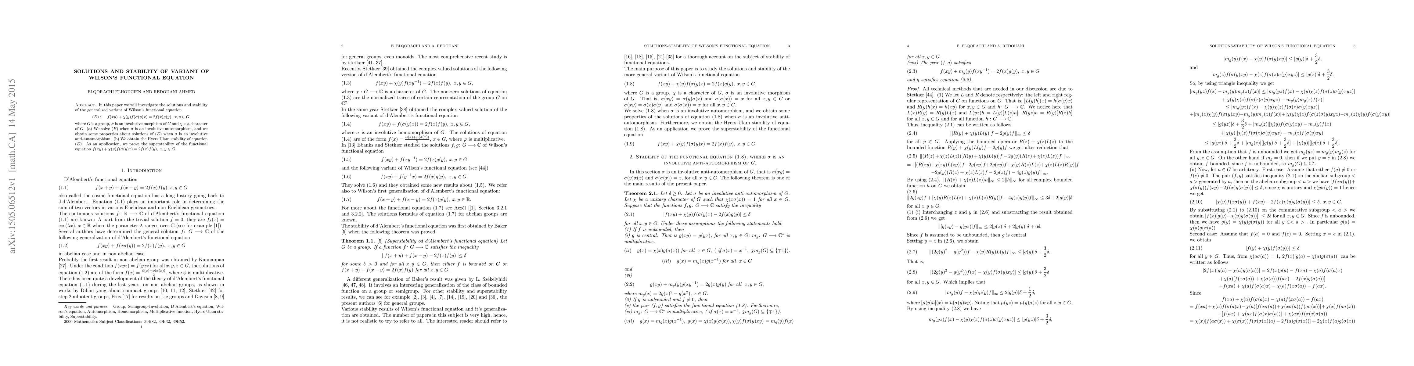 This paper explores solutions and stability for a generalized variant of Wilson's functional equation involving a group \( G \). It provides solutions when \( \sigma \) is an involutive automorphism and investigates properties for involutive anti-automorphisms. It also establishes Hyers-Ulam stability and demonstrates superstability for a specific related functional equation.