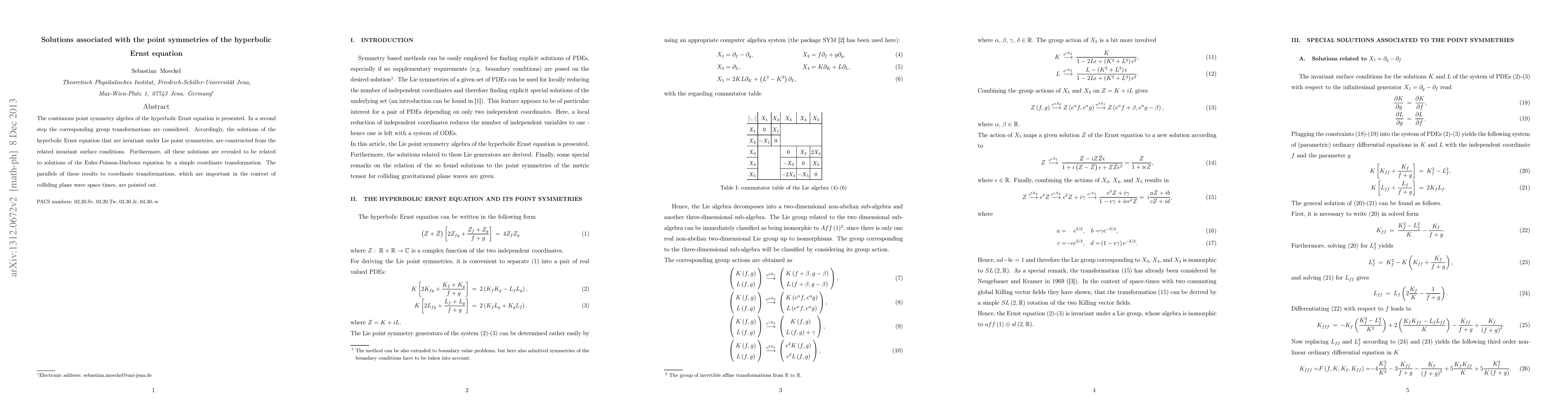 The continuous point symmetry algebra of the hyperbolic Ernst equation is presented. In a second step the corresponding group transformations are considered. Accordingly, the solutions of the hyperbolic Ernst equation that are invariant under Lie point symmetries, are constructed from the related invariant surface conditions. Furthermore, all these solutions are revealed to be related to solutions of the Euler-Poisson-Darboux equation by a simple coordinate transformation. The parallels of these results to coordinate transformations, which are important in the context of colliding plane wave space times, are pointed out.