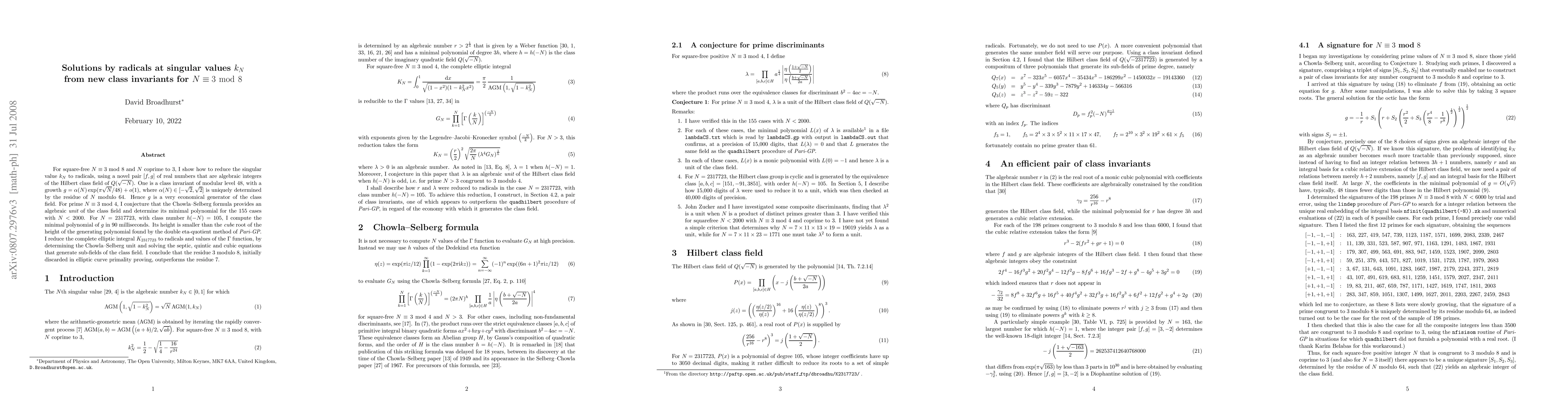 For square-free $N\equiv3$ mod 8 and $N$ coprime to 3, I show how to reduce the singular value $k_N$ to radicals, using a novel pair $[f,g]$ of real numbers that are algebraic integers of the Hilbert class field of $Q(\sqrt{-N})$. One is a class invariant of modular level 48, with a growth $g=\alpha(N)\exp(\pi\sqrt{N}/48)+o(1)$, where $\alpha(N)\in[-\sqrt2,\sqrt2]$ is uniquely determined by the residue of $N$ modulo 64. Hence $g$ is a very economical generator of the class field. For prime $N\equiv3$ mod 4, I conjecture that the Chowla--Selberg formula provides an algebraic {\em unit} of the class field and determine its minimal polynomial for the 155 cases with $N<2000$. For N=2317723, with class number $h(-N)=105$, I compute the minimal polynomial of $g$ in 90 milliseconds. Its height is smaller than the {\em cube} root of the height of the generating polynomial found by the double eta-quotient method of {\em Pari-GP}. I reduce the complete elliptic integral $K_{2317723}$ to radicals and values of the $\Gamma$ function, by determining the Chowla--Selberg unit and solving the septic, quintic and cubic equations that generate sub-fields of the class field. I conclude that the residue 3 modulo 8, initially discarded in elliptic curve primality proving, outperforms the residue 7.