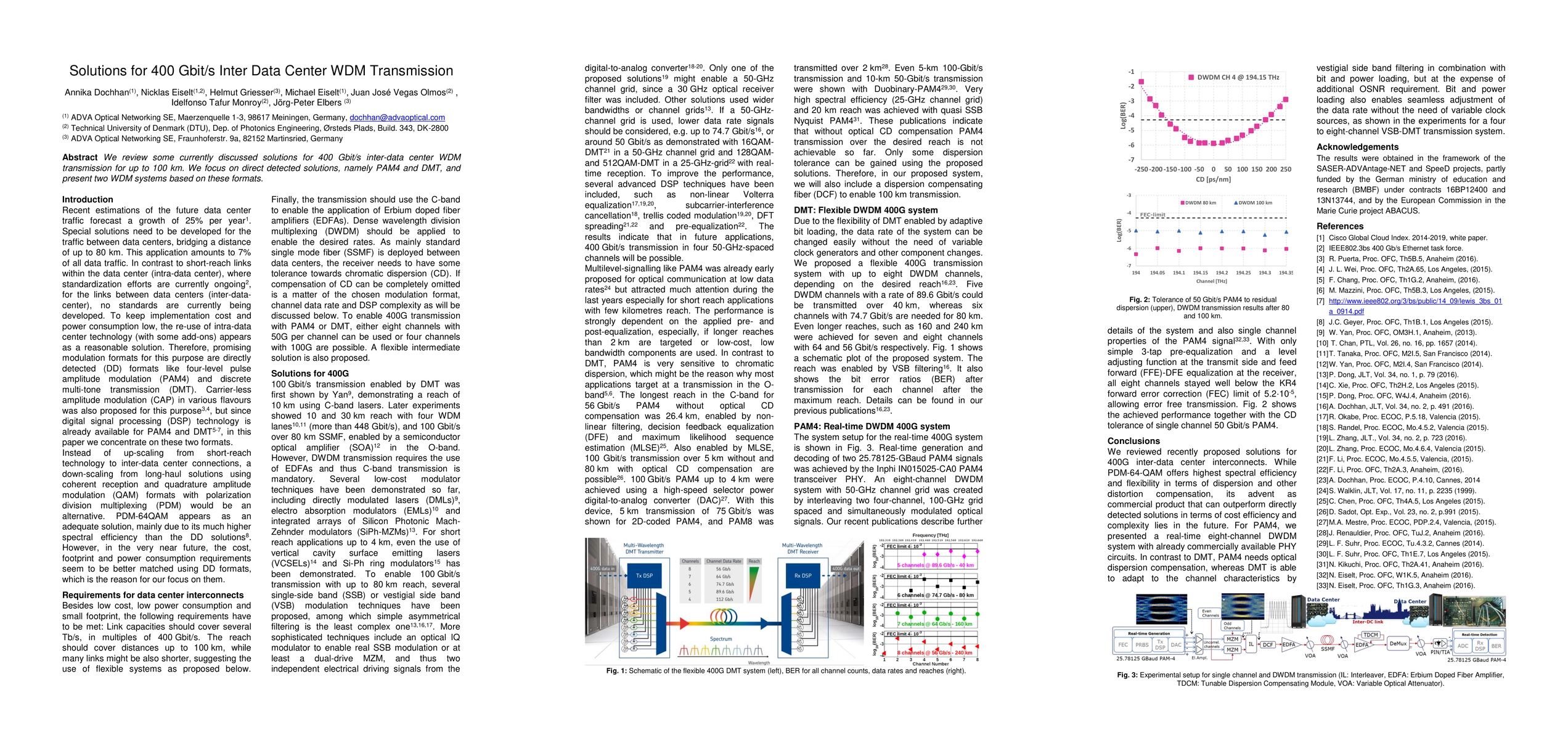 We review some currently discussed solutions for 400 Gbit/s inter-data center WDM transmission for up to 100 km. We focus on direct detected solutions, namely PAM4 and DMT, and present two WDM systems based on these formats.