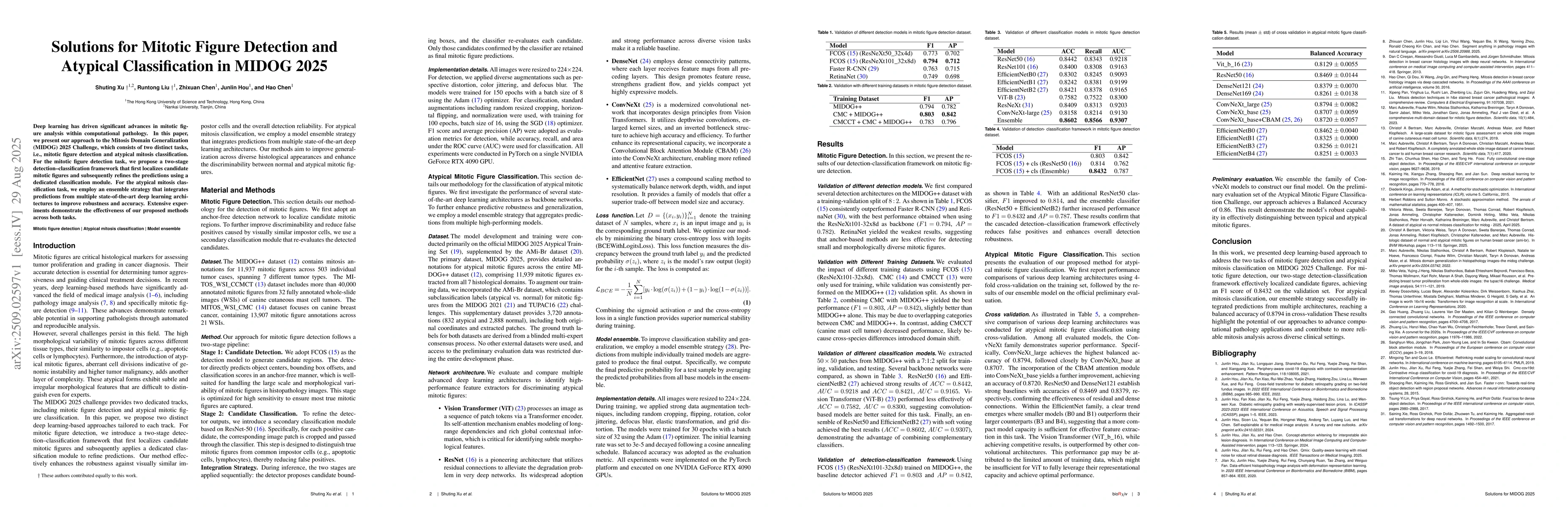 Deep learning has driven significant advances in mitotic figure analysis within computational pathology. In this paper, we present our approach to the Mitosis Domain Generalization (MIDOG) 2025 Challenge, which consists of two distinct tasks, i.e., mitotic figure detection and atypical mitosis classification. For the mitotic figure detection task, we propose a two-stage detection-classification framework that first localizes candidate mitotic figures and subsequently refines the predictions using a dedicated classification module. For the atypical mitosis classification task, we employ an ensemble strategy that integrates predictions from multiple state-of-the-art deep learning architectures to improve robustness and accuracy. Extensive experiments demonstrate the effectiveness of our proposed methods across both tasks.