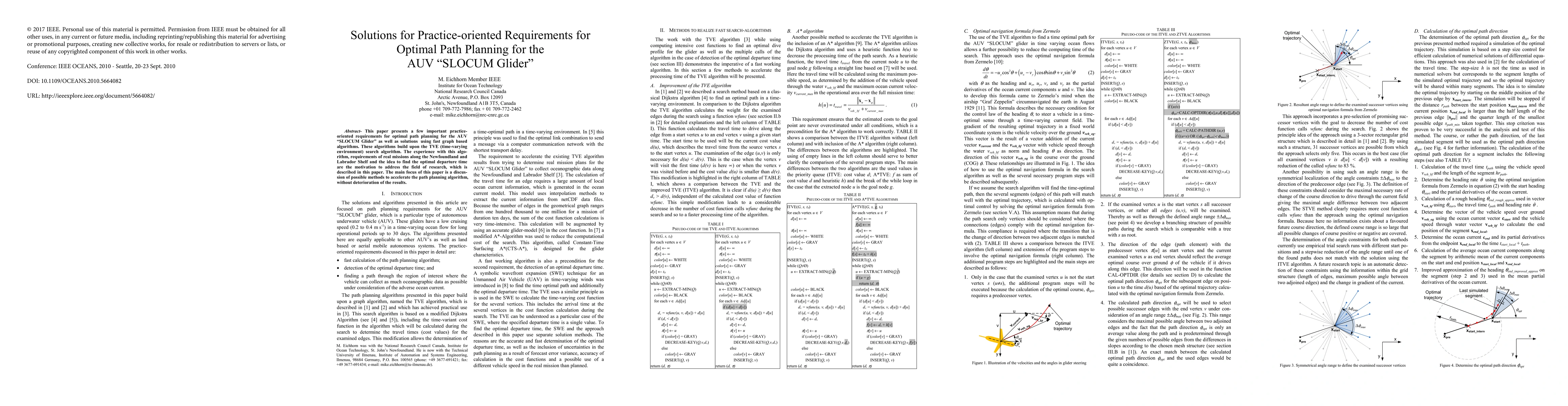 This paper presents practice-oriented requirements for optimal path planning for the AUV 'SLOCUM Glider' using fast graph-based algorithms, focusing on accelerating the TVE algorithm without deteriorating results. It also discusses methods for determining the optimal departure time and maximizing oceanographic data collection.