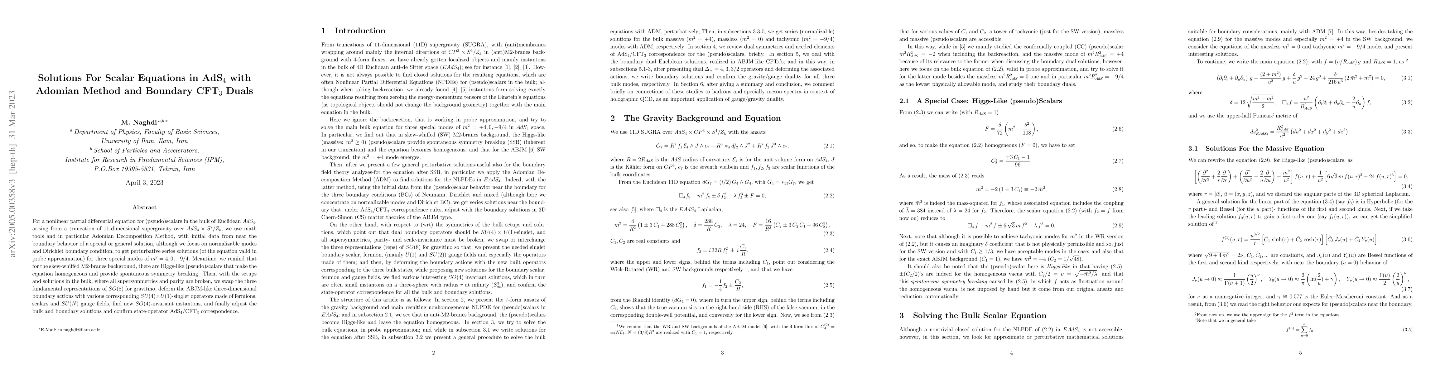 For a nonlinear partial differential equation for (pseudo)scalars in the bulk of Euclidean AdS_4, arising from a truncation of 11-dimensional supergravity over AdS_4 x S^7/Z_k, we use math tools and in particular Adomian Decomposition Method, with initial data from near the boundary behavior of a special or general solution, although we focus on normalizable modes and Dirichlet boundary condition, to get perturbative series solutions (of the equation valid in probe approximation) for three special modes of m^2=4, 0, -9/4. Meantime, we remind that for the skew-whiffed M2-branes background, there are Higgs-like (pseudo)scalars that make the equation homogeneous and provide spontaneous symmetry breaking. Then, with the setups and solutions in the bulk, where all supersymmetries and parity are broken, we swap the three fundamental representations of SO(8) for gravitino, deform the ABJM-like three-dimensional boundary actions with various corresponding SU(4) x U(1)-singlet operators made of fermions, scalars and SU(N) gauge fields, find new SO(4)-invariant instantons, and finally adjust the bulk and boundary solutions and confirm state-operator AdS_4/CFT_3 correspondence.