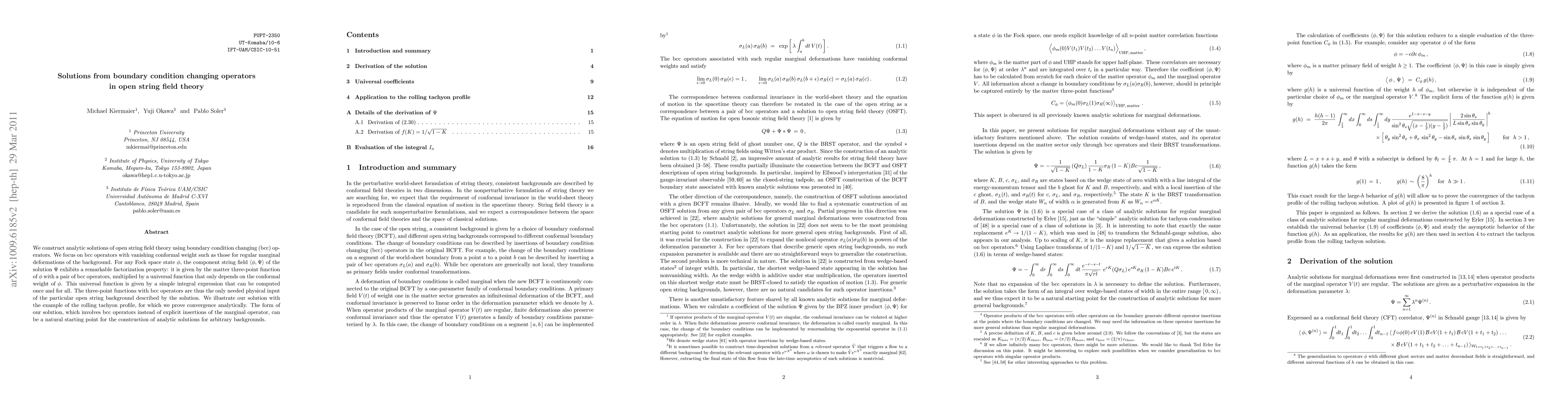 This paper constructs analytic solutions for open string field theory using boundary condition changing operators, demonstrating a factorization property for the string field solution. It shows that the solution involves three-point functions of the string field with these operators, simplifying the physical input required for the solution.