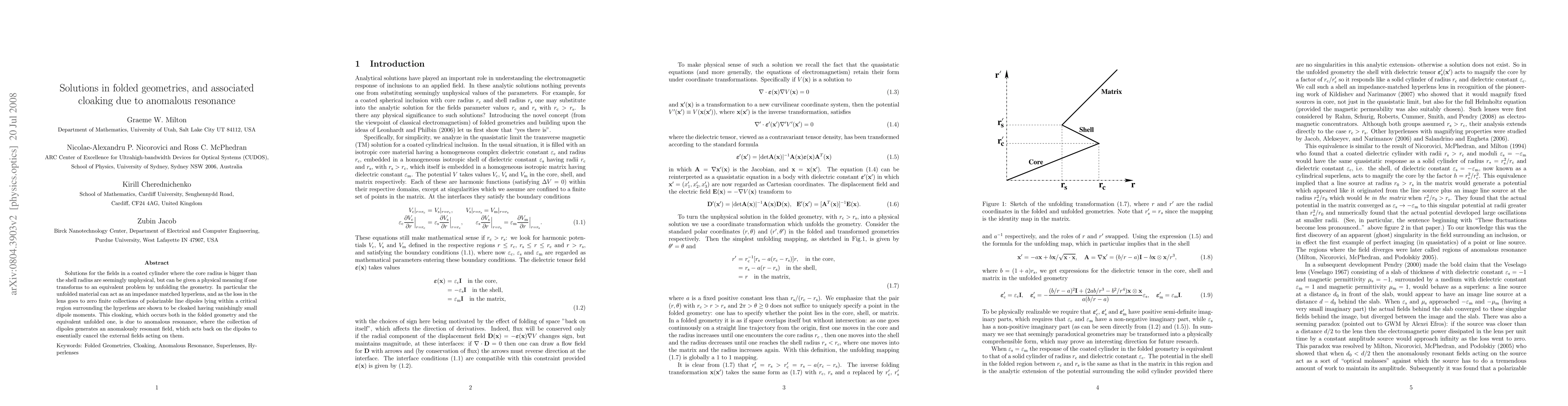 This paper explores solutions in folded geometries, specifically coated cylinders, where the core radius exceeds the shell radius. By unfolding the geometry, the material acts as an impedance-matched hyperlens, enabling cloaking via anomalous resonance, where dipoles within a critical region cancel external fields.